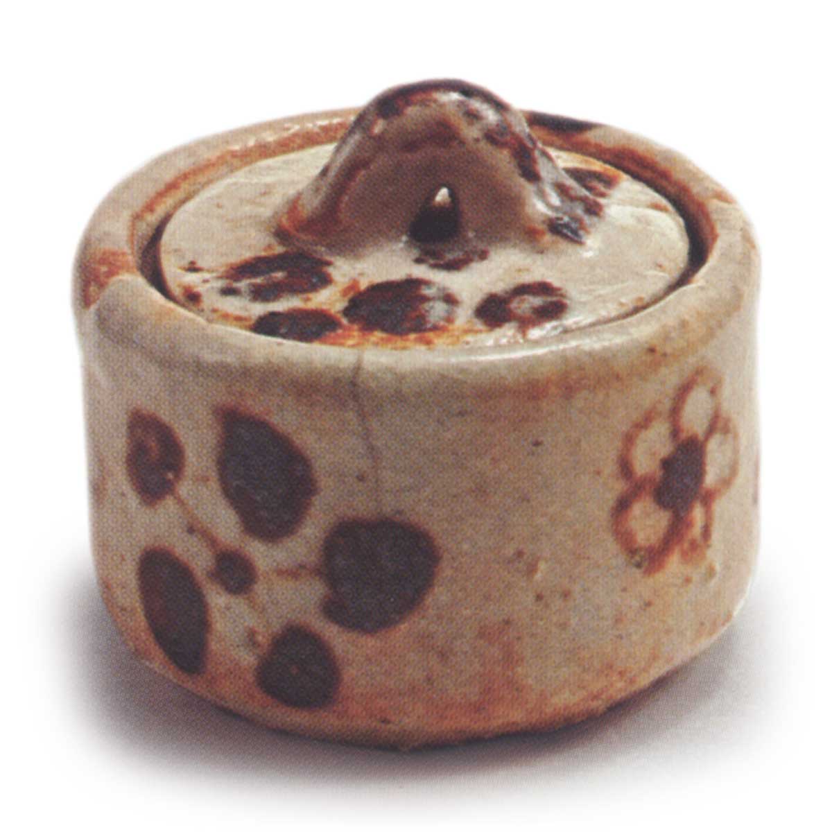 志野梅文香合 志野志野梅文香合 2025.07.05 志野梅文香合 高度4.0厘米 口径4.7厘米 底径3.6厘米轆轤成形的筒形香合,盖面和器身饰有梅鉢和梅花纹样。底部平坦,丝切痕迹隐约可见。色泽红润,是一件精美的香合。