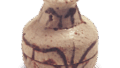 志野菊花纹香合 志野志野菊花纹香合 2025.07.05 志野菊花纹香合 高度4.0厘米 口径4.3厘米 底径2.4厘米该作品与“手轮香盒”作风相似,但盖子边缘较高,盖面饰有十瓣菊花纹样。白釉质地柔和,铁绘色泽鲜艳。盖侧面环绕点斑纹,器身饰有矢来纹与若松纹。