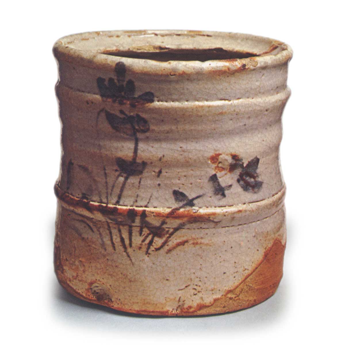 志野橘纹矢筈口水指 志野志野橘纹矢筈口水指 2025.07.052025.11.14 志野橘纹矢筈口水指 志野橘纹矢筈口水指 高度19.3厘米 口径18.6厘米 底径17.5厘米高脚矢筈口水指,口部下方和胴中部有阶梯状结构,轮廓线条舒展流畅。胴体两侧饰有橘子般的文样与草花纹,以釉料覆盖,底部留有趣味,釉面断裂处显露红色。底部残留有线切痕。此为志野水指中的代表性作品之一。