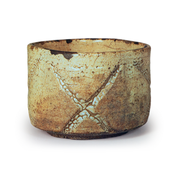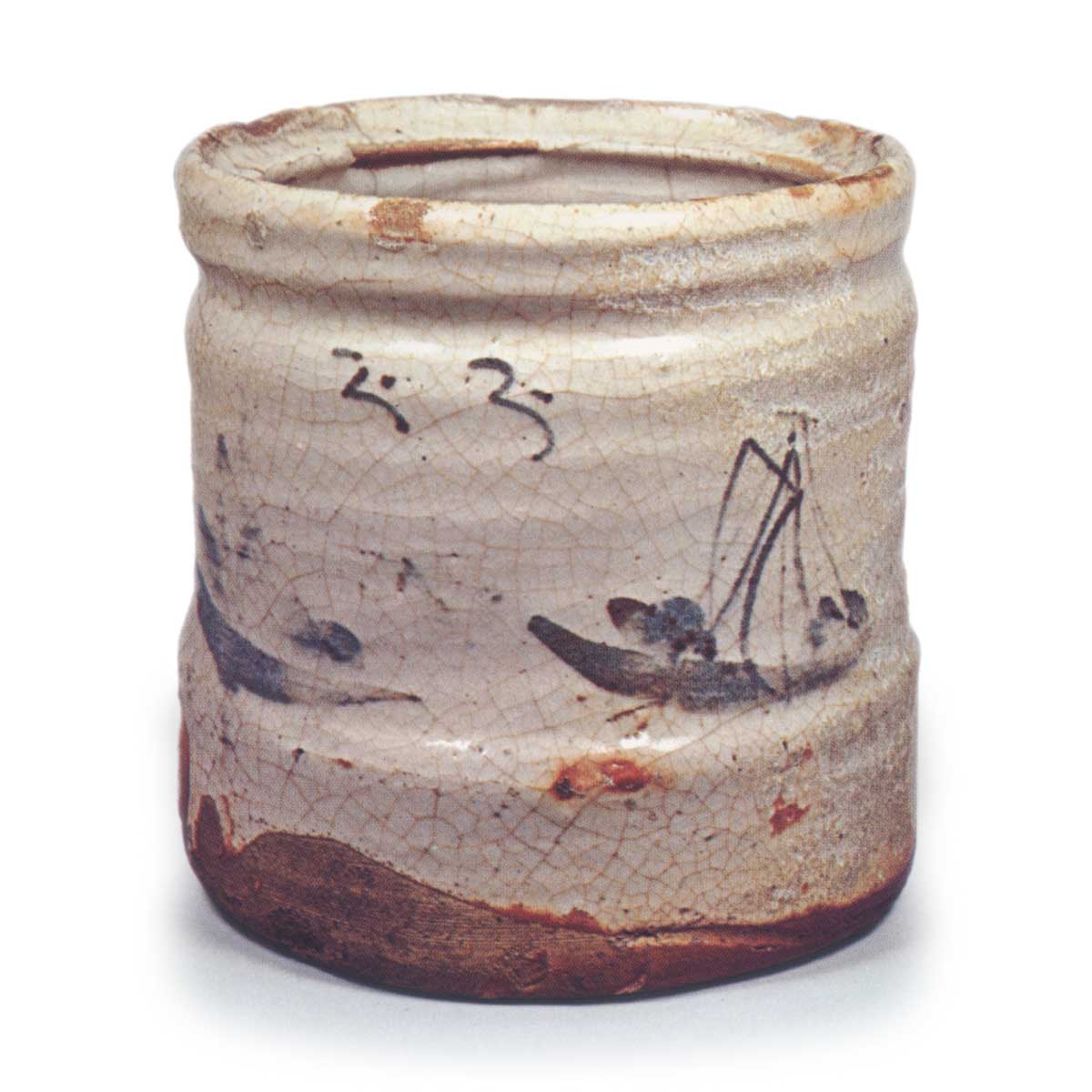 与志野橘纹矢筈口水指极为相似,是一款口部高耸的水指。器身饰有帆船图案,背面则绘有类似紫罗兰的野草图案,帆船上空还描绘了海鸥,整体构图如同一幅画作。整体覆盖的白色釉层厚实,部分有开片,但釉面柔和。底部为线切平底,边缘的陶土部分透出红色。