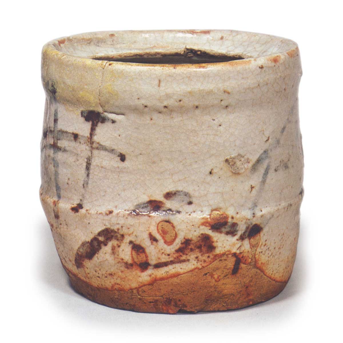 志野矢口水指 志野志野矢口水指 2025.07.052025.11.14 志野矢口水指 高度17.3厘米 口径17.8厘米 底径16.1厘米五岛美术馆水指的裙边略微收窄,整体呈现出温和雅致的风格。器身绘有图案,但图案不清晰,似竹矢来纹样,器底边缘饰有草花纹样。整体釉面光滑融和,器底边缘透出红色。釉烧时留下的指痕形成独特纹理,颇具趣味。器内有圆形放置痕迹,上方有釉剥落修补的痕迹。