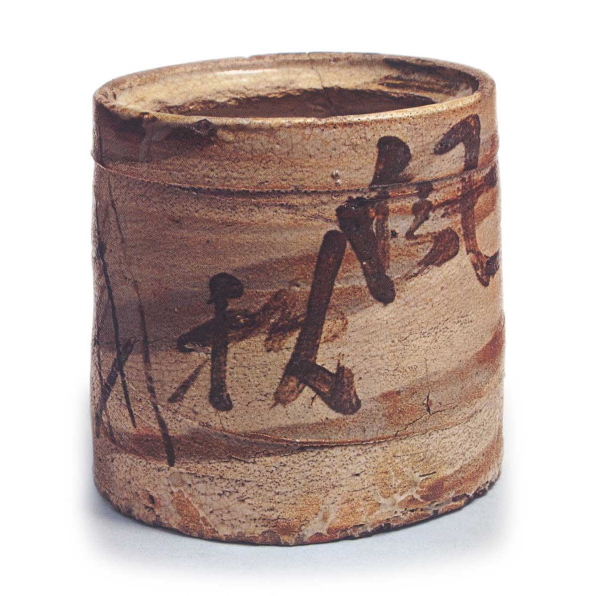 练志野秋风文字水指 志野练志野秋风文字水指 2025.07.052025.11.14 练志野秋风文字水指 练志野秋风文字水指 高度18.7厘米 口径18.7厘米 底径19.0厘米练志野水指的代表作。采用白土与赤土等量混合后经轮盘拉坯成型。口部周围清晰地勾勒出一条直线,呈现出简洁利落的造型。表面饰有类似檜垣的图案,一侧刻有“风秋透心冬”的文字。此类练志野水指极为罕见,与图146的水指并列为同类中的杰作。内壁可见放置痕迹,平坦的底部也保留有放置痕迹。