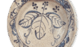 志野山水纹鉢 志野志野山水纹鉢 2025.07.09 志野山水纹鉢 高度7.5厘米 口径28.7厘米 四脚与志野桐纹碗形状相似的碗,碗内侧饰有类似蓬莱山的山水纹样。天空中飞翔着五只鸟,开口处环绕着类似桐花的唐草纹样,整体釉面光滑。底部四角带有脚,脚间不规则地留有四个大眼痕,碗内侧还可见五个小眼痕。
