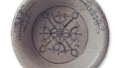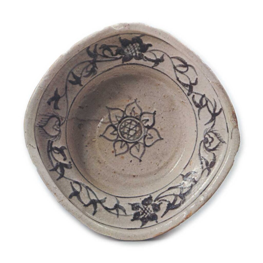 志野唐花纹鉢 志野志野唐花纹鉢 2025.07.09 志野唐花纹鉢 高度9.1厘米 口径25.2-25.6厘米 三脚碗口呈抚四方形,碗内绘有七瓣花纹,周围饰以花唐草纹样。花唐草纹样和碗口花纹带有更纱风格,可见南蛮风格的影响。底部三面有脚,碗口有三个小眼痕,脚之间留有五个大眼痕。整体釉面融化良好,但红色较淡。