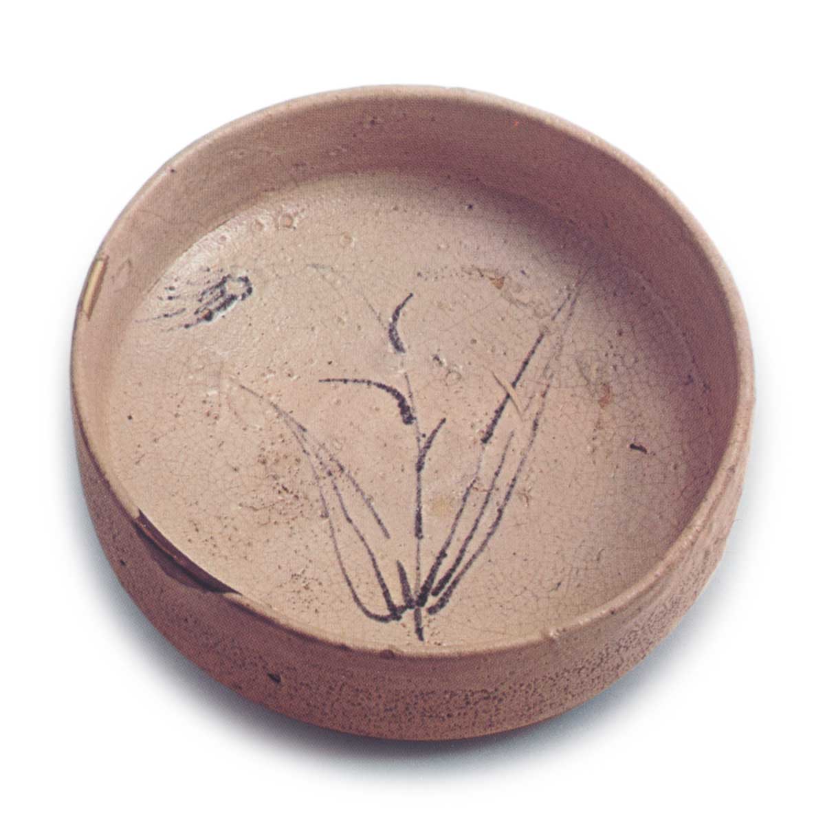 志野草花纹花鉢 志野志野草花纹花鉢 2025.07.09 志野草花纹花鉢 高度7.9厘米,口径25.8厘米,底径18.8厘米与前图采用相同风格,应为同一窑作。描绘了一株麦子般的草,笔触轻巧灵动。釉面均匀覆盖,但红色不足,呈现略带黄色调的釉面。高台采用同样的棋盘底式,略显不稳,背面釉面有轻微收缩。内壁有数处釉面粘连,与釉痕难以区分。