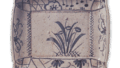志野芦雁纹额盘 志野志野芦雁纹额盘 2025.07.09 志野芦雁纹额盘 高度4.4厘米,口径19.5-22.2厘米,四脚该作品与志野网干文额盘完全同款,盘面以芦苇般的纹样为主体,天空中描绘有雁的图案。制作手法与志野芦雁文额盘基本相同,但釉层稍厚,红色调几乎不显。盘面留有四个足痕,四角均附有脚。