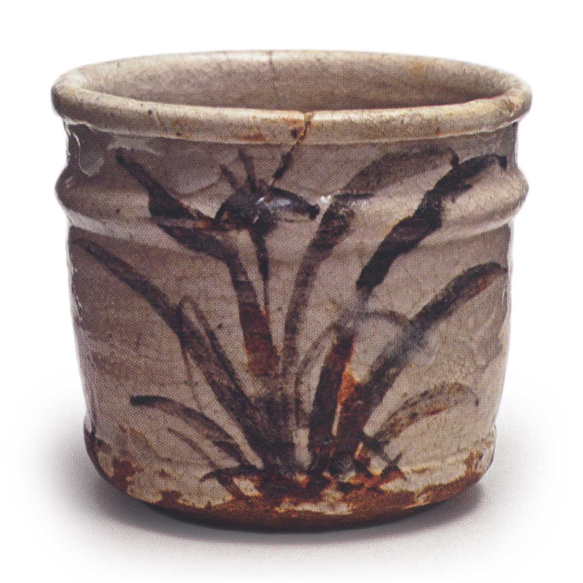 志野菖蒲纹猪口 志野志野菖蒲纹猪口 2025.07.11 志野菖蒲纹猪口 高度9.1厘米 口径10.1厘米 底径6.5厘米筒形的小巧猪口,胴体上部环绕着粗壮的胴纽。采用较粗的笔触,绘有菖蒲、万年青、紫罗兰等图案。底部有轮高台,从腰部至底部露出陶土。高台内留有四个目痕。