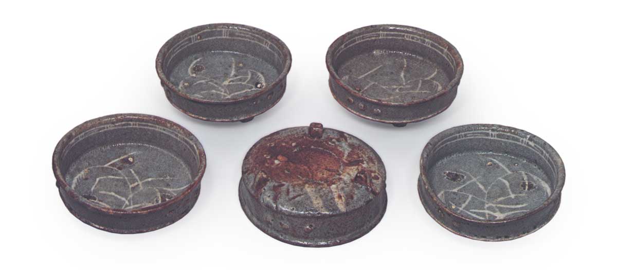 鼠志野芒纹向付 志野鼠志野芒纹向付 2025.07.11 鼠志野芒纹向付 鼠志野芒纹向付 鼠志野芒纹向付 鼠志野芒纹向付 鼠志野芒纹向付 鼠志野芒纹向付 鼠志野芒纹向付 高度5.2厘米 口径15.2厘米 三脚 萬野美术馆鼠志野的向付中较为罕见的正圆形向付,底部三面带有脚,胴部环绕着擂座。传世品共十件,每五件为一对,其中两件胴部饰有铁绘图案,其余八件均采用相同制作手法。所有作品底部均为红色,呈现鼠志野特有的焦痕,并留有轮形放置痕迹。此外,器身内侧可见大小不一的六个目痕。