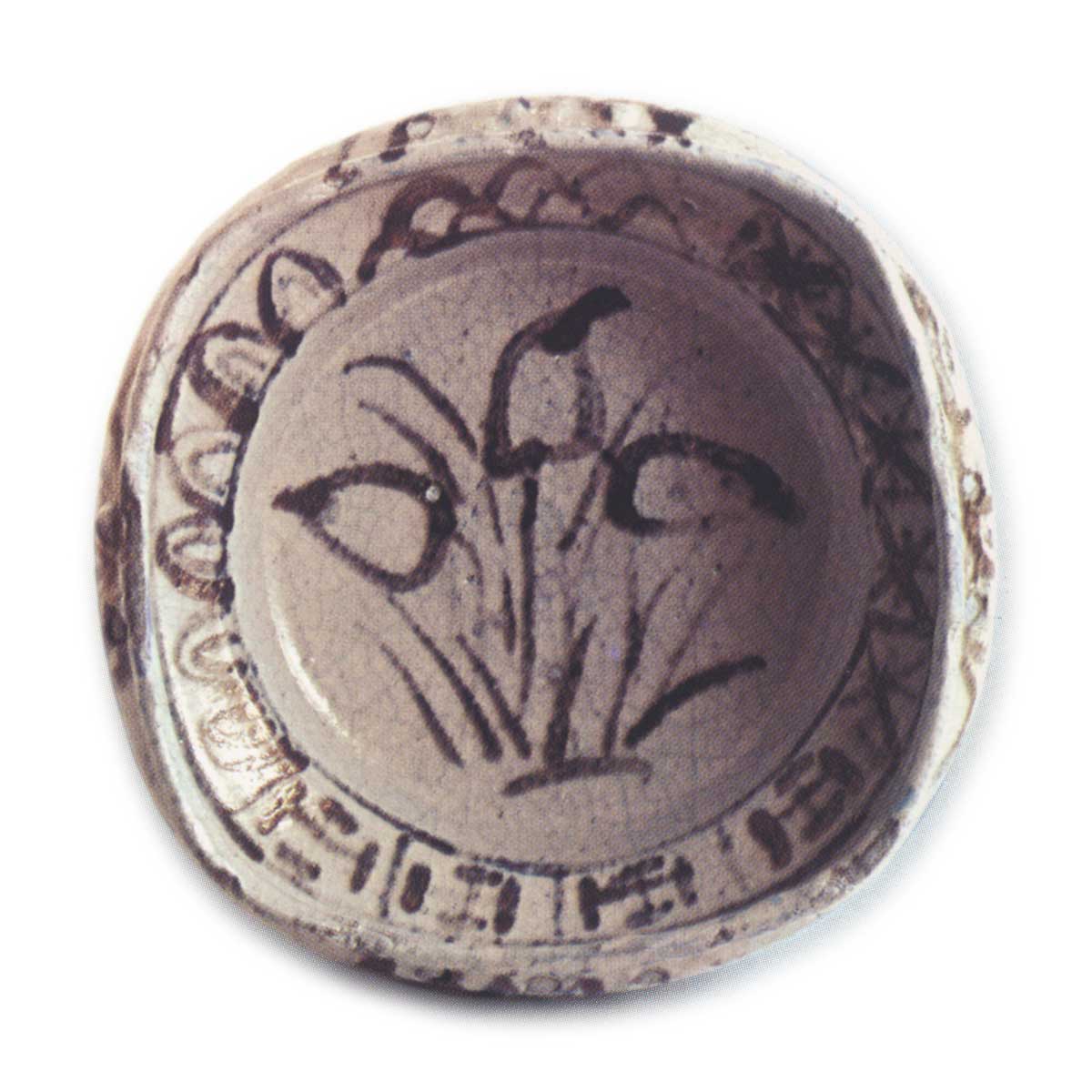 志野草花纹向付 志野志野草花纹向付 X Facebook Hatena Bookmark LINE Pinterest 复制 2025.07.12 志野草花纹向付 高度6.2厘米,口径16.1厘米,三脚口部呈圆形,口缘向内收缩,形成鐔状,整体为抚四方形。口部饰有草花纹,鐔状部分绘有莲花瓣、卍纹等图案,笔触略显粗犷。口部外侧不规则地附有擂座,底部三方有脚。内口残有三处小目痕,底部脚的内侧也可见椭圆形放置痕迹。