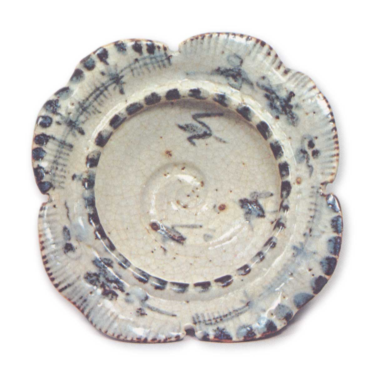志野千鸟纹向付 志野志野千鸟纹向付 2025.07.12 志野千鸟纹向付 高度5.6厘米 口径15.8厘米 三脚器身呈圆形,开口部分以四瓣轮花形展开,并将其部分向下压入并向外弯曲。此类向付造型罕见,目前仅存十件成对传世。盘面残留涡状轆轤纹,其间饰千鸟纹,口部施两种几何纹样。釉色融和光泽,部分呈现红色调。盘面与底部留有施釉痕迹。