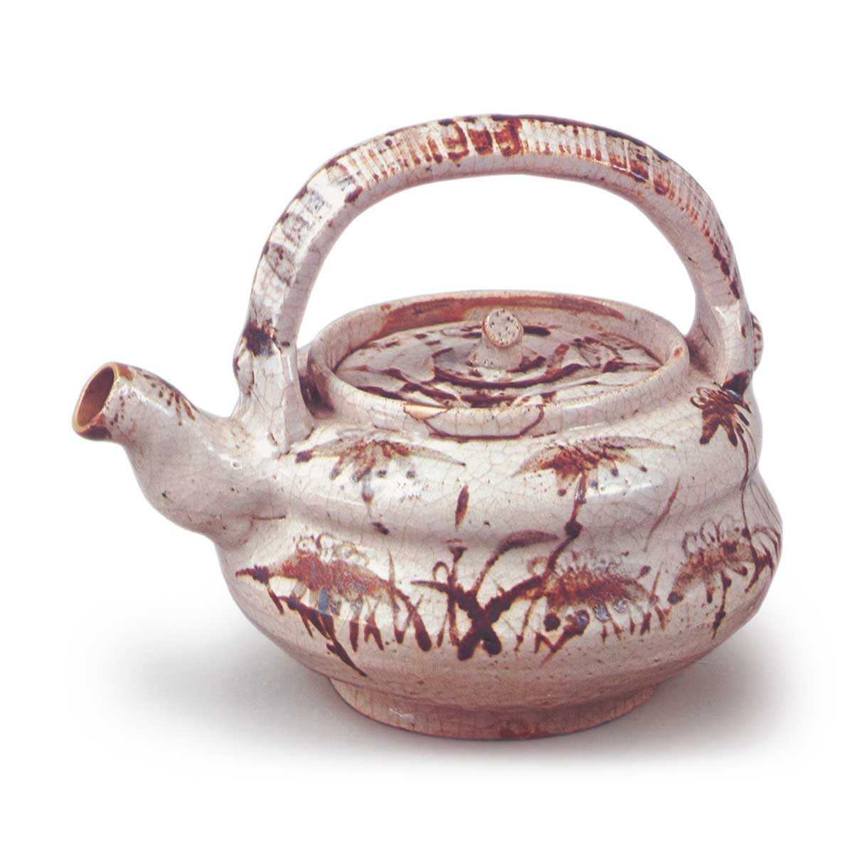 志野笹纹酒壶 志野志野笹纹酒壶 2025.07.12 志野笹纹酒壶 总高16.5厘米,左右宽20.2厘米,底径9.8厘米壶身分为两段,注口和把手与前图相同,但把手根部贴有类似座金的装饰,底部为轮状高台。壶身绘有类似笹的植物纹样,把手则饰有几何纹样。