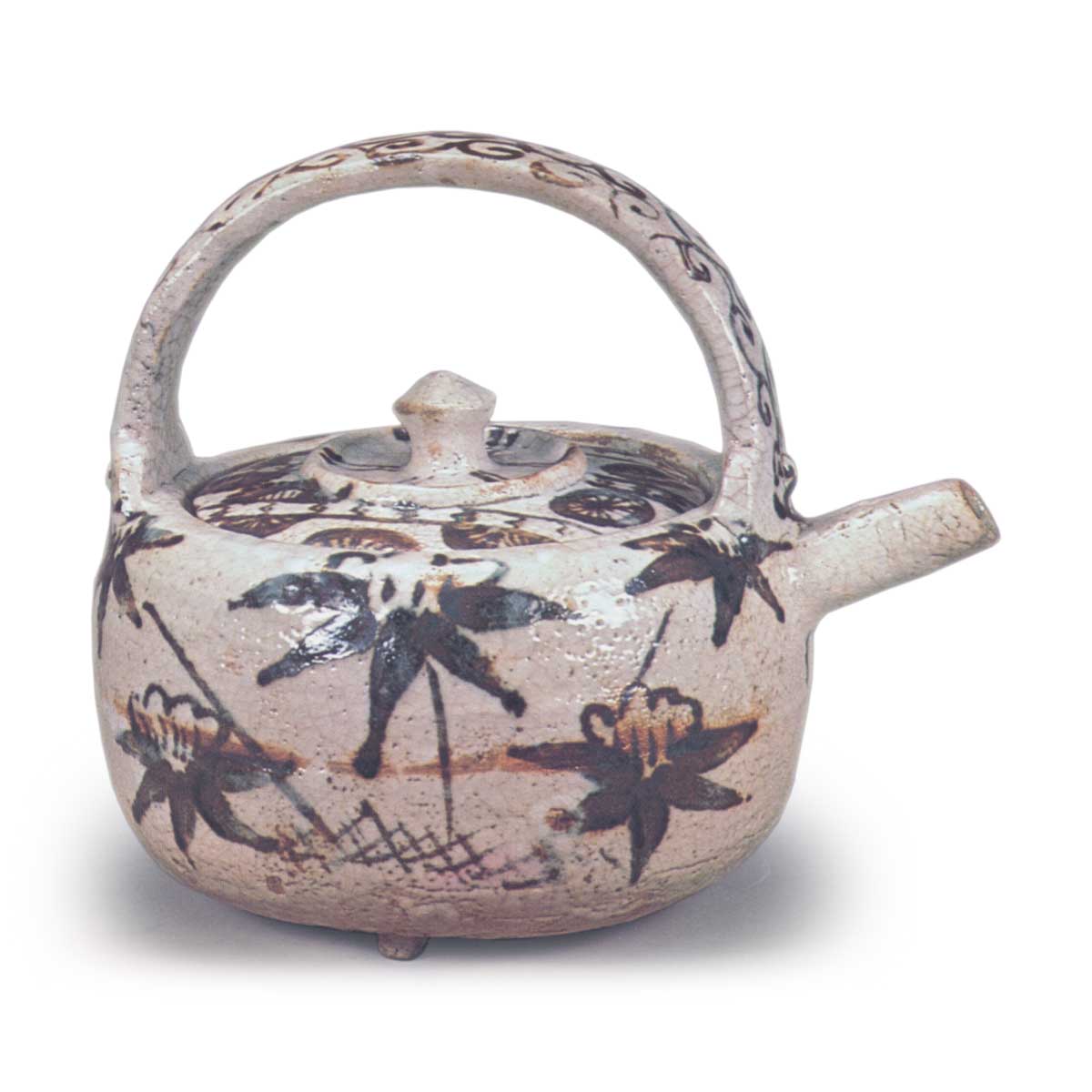 志野笹纹酒壶 志野志野笹纹酒壶 2025.07.12 志野笹纹酒壶 总高19.5厘米志野笹纹酒壶与其他器型略有不同,壶身饱满圆润。壶身中央以大型竹叶纹样装饰,搭配鲜艳的红色釉色,给人留下深刻印象,被视为志野酒壶的代表作之一。底部配有三个小脚。