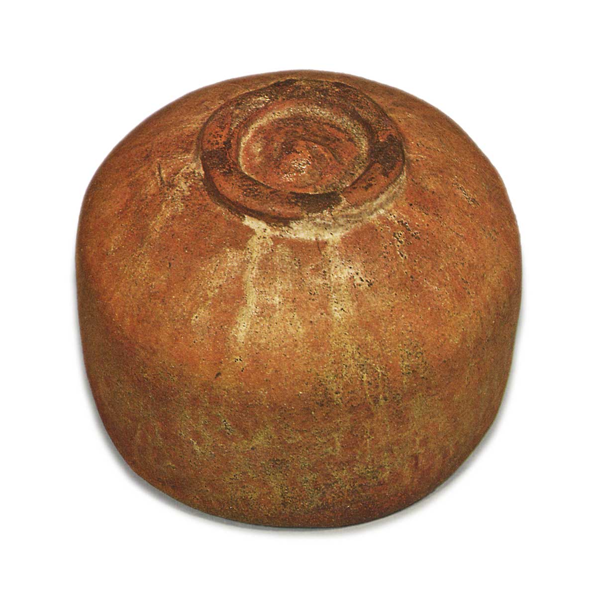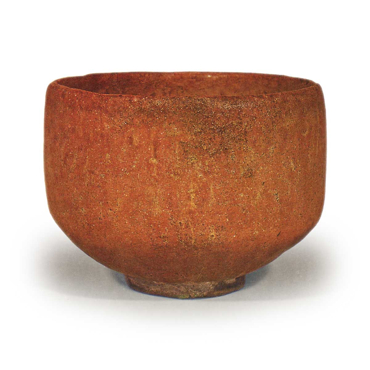 碗身厚实,口部略微内收,从腰部至高台处呈现早船风格,但整体线条更为圆润,整体给人以温雅宁静之感,充分展现了利休的典型造型。红土质地,釉色略显透光,薄薄地覆盖在素地上,使红土色若隐若现。釉面略显粗糙,处处可见白斑,尤其是高台边缘的釉色脱落和釉积处更为明显,呈现出醒目的白色。内底釉完全脱落,素地显露,边缘呈白色。高台底部部分露出土质,内部呈巴字形,有五个小孔。