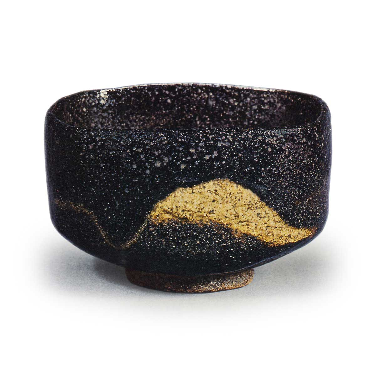 素地为白土,土见从道入开始,与长次郎相比是一个特点。薄作,略微抱,涂有道入特有的光泽漆黑釉,从口边到胴部呈垂幕状,即所谓的道入幕釉。正面幕釉之后,还有道入擅长的黄抜け远山形,构成宏大的景致。