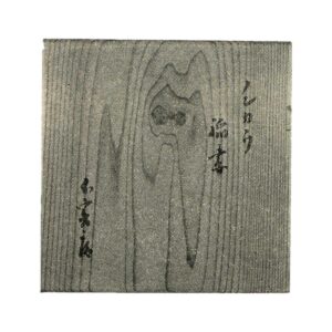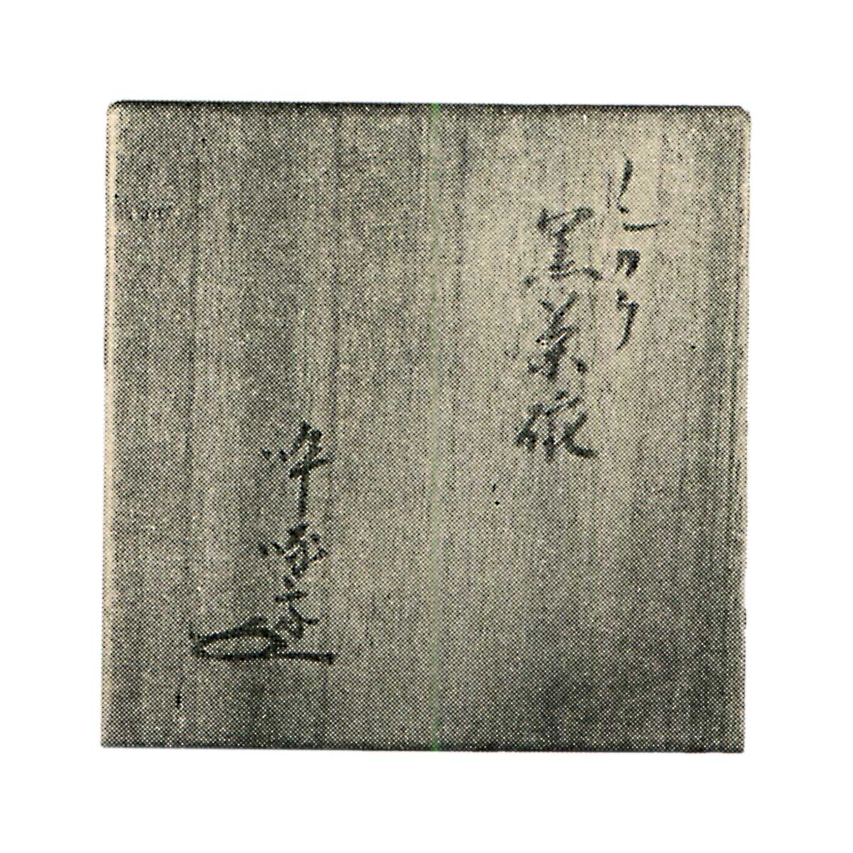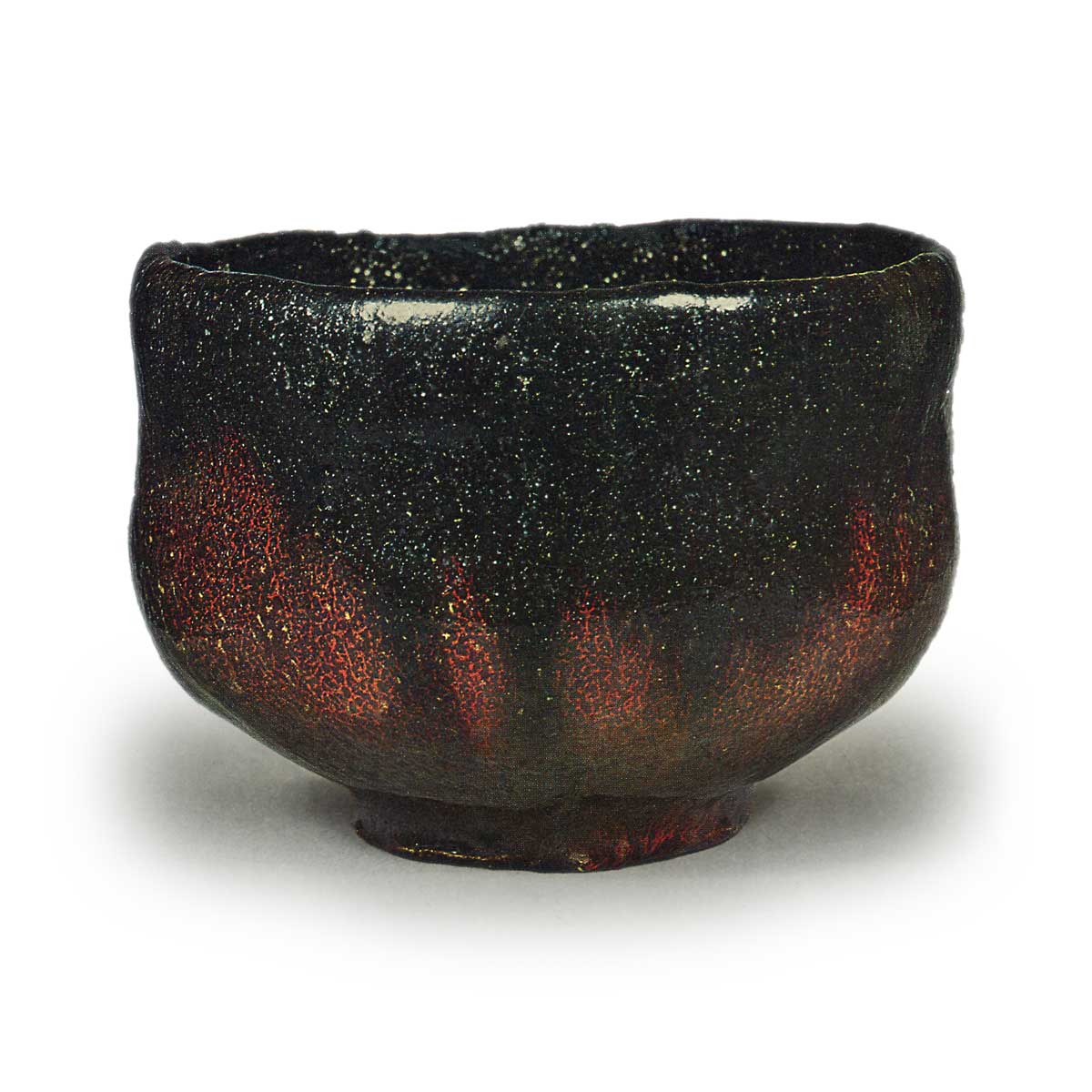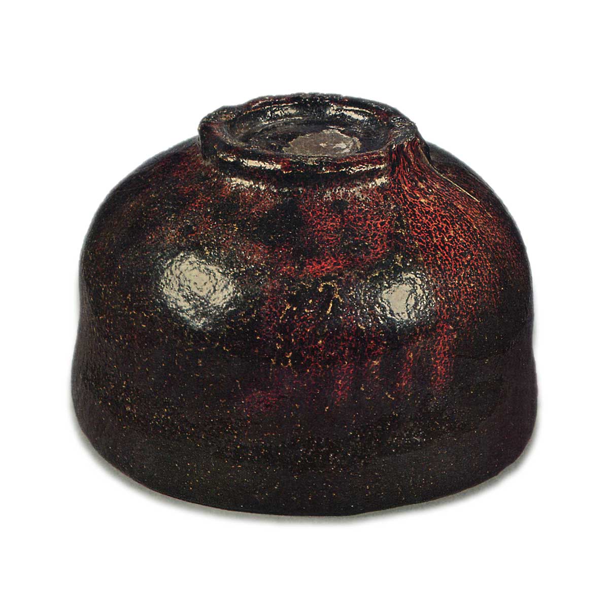 器形薄壁,口部略微内收,胴部收紧,无釉幕,底部圆润。腰部鲜艳的朱釉在漆黑的底色上格外醒目,是其显著特色。朱釉是世间独一无二的,但其实是从道入开始,是他独创的一种釉法。高台很大,有四个脚,里面有半月形的土见。这是道入七种中独树一帜的一只茶碗。这是表千家传下来的历史悠久的茶碗,除了更换仪式外,不得使用。