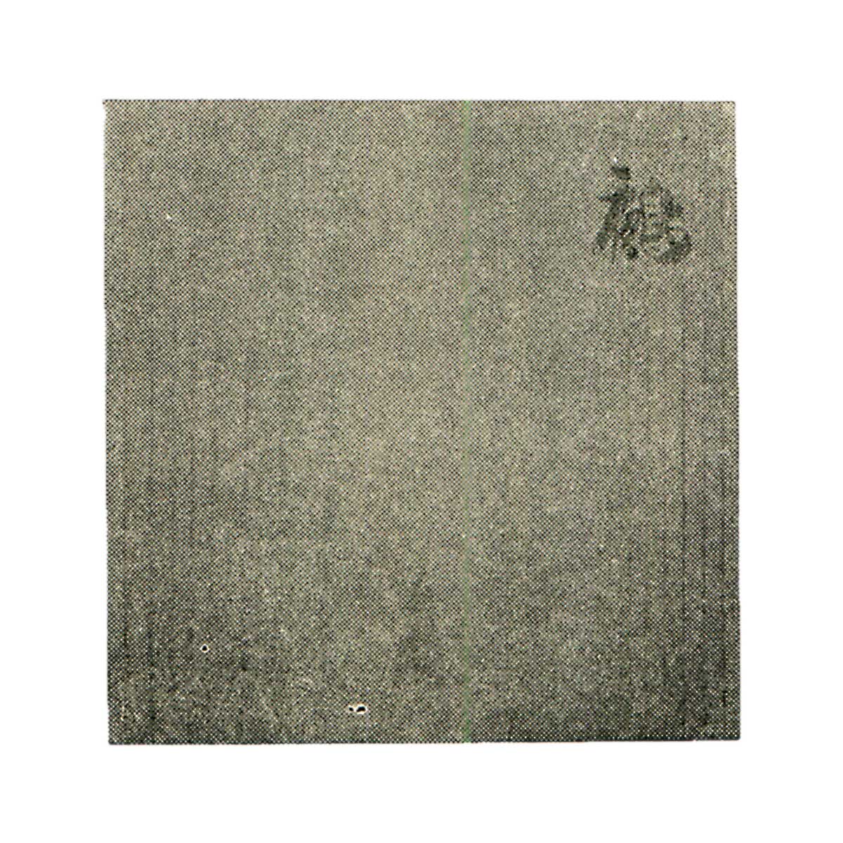 素地为红色,未见土色,但其鲜艳的色调推测应为涂抹黄土所致。口缘略微内收形成山道,采用竖横交错的跳针技法,为器形增添变化。半面混入绿釉,正面大面积涂抹黑色刷毛,展现出出人意料的豪放设计。透过略显透明的釉面,隐约可见鲜艳的红色,釉面整体浮着不均匀的白色斑点。高台切口较深,底面平坦,朱红色中略带黄色,内侧印有乐印。强烈的跳跃纹饰,红色、黑色、绿色相映成趣,这种华丽的图案充分体现了道入的特色。