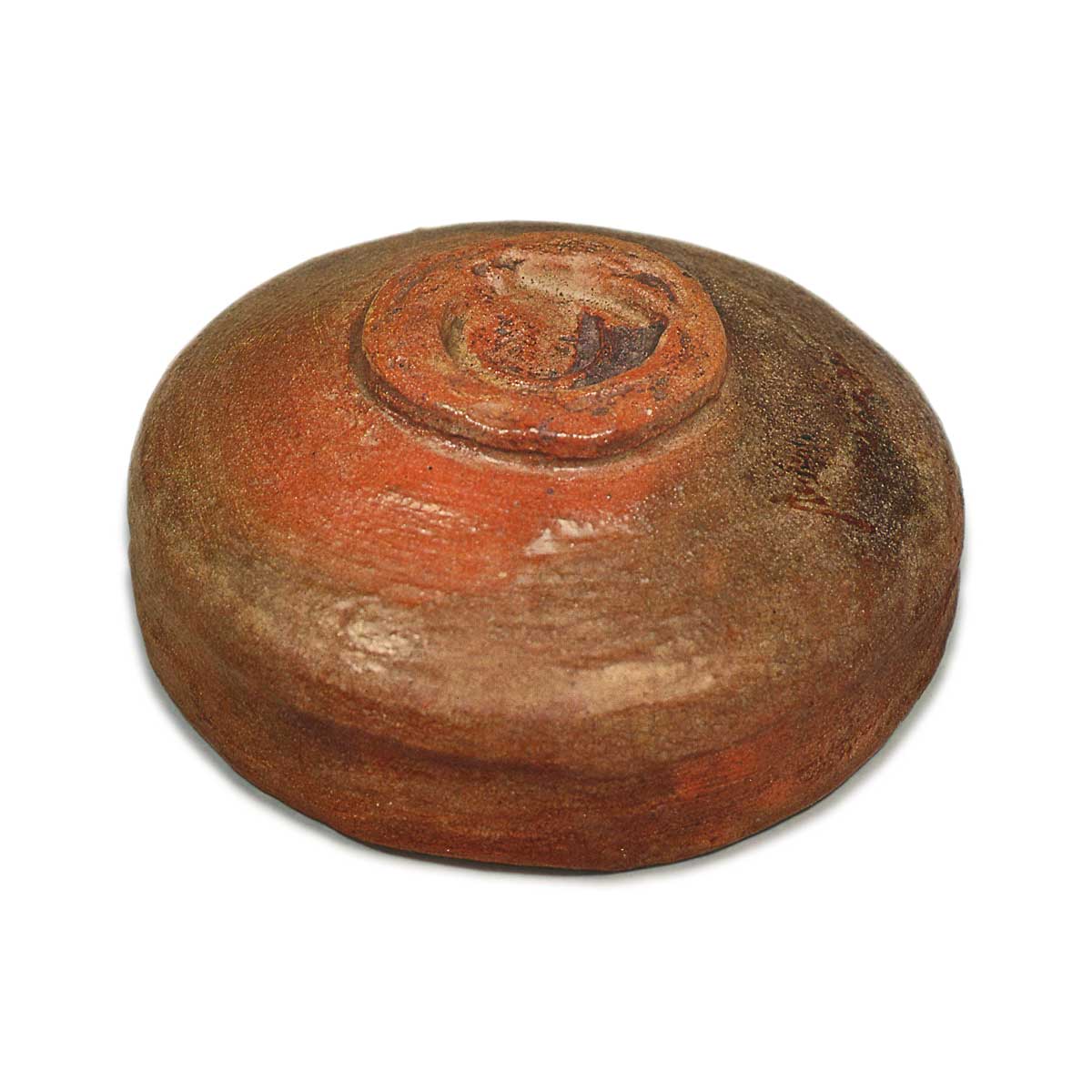 碗身使用了强烈的横向篾条,高台两侧可见独特的梳纹。红土质地,釉色略显透光,土色不显,白色的斑驳在半面火烧后显现,形成片身替的纹理。高台宽大,平坦如垫,内侧有乐印压印,边缘的切口锐利。