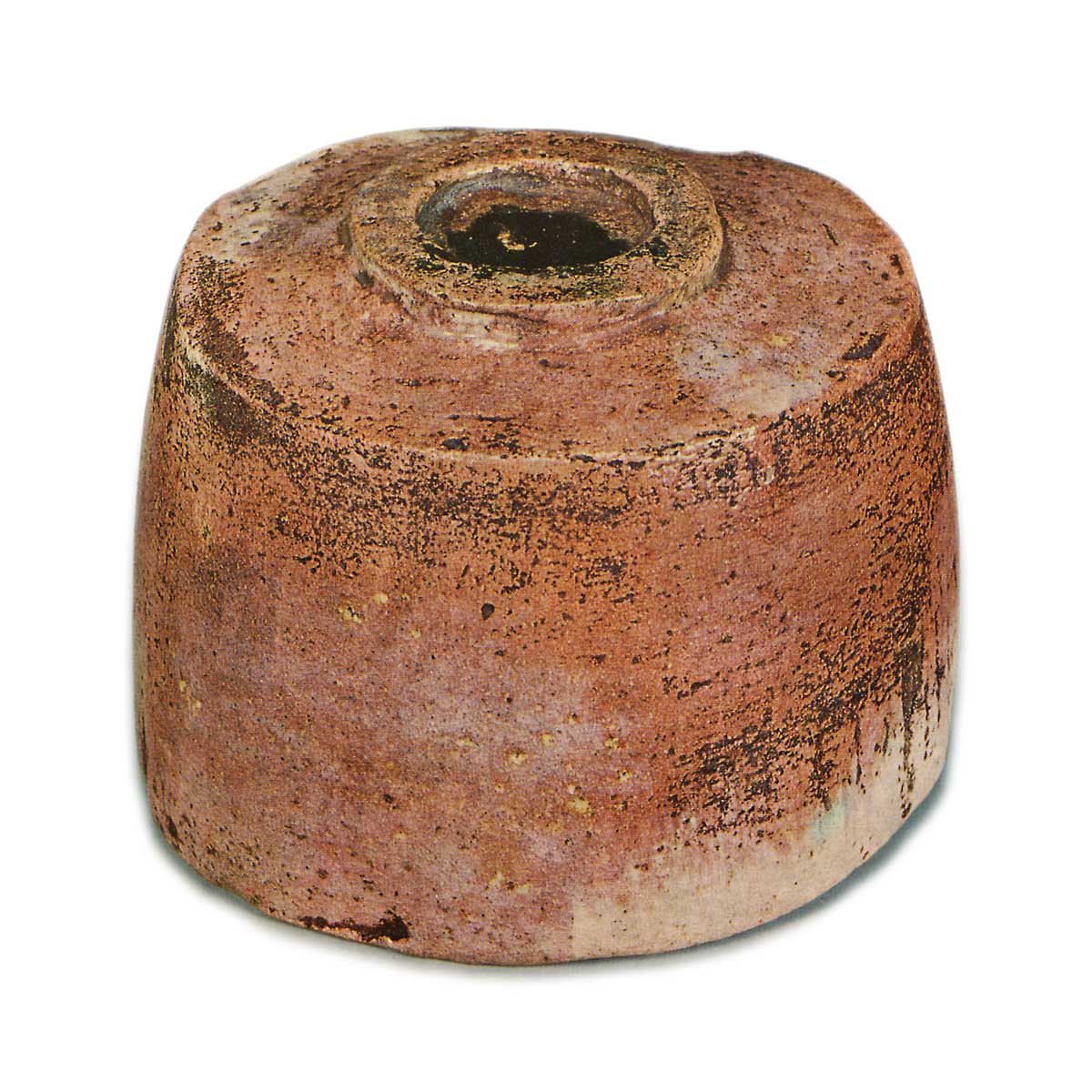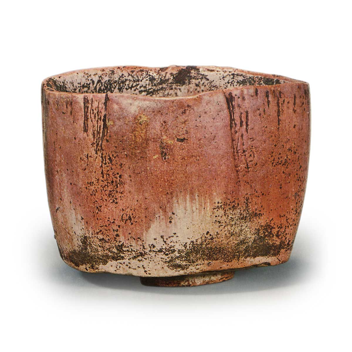 角形茶碗的代表作,尤其光悦擅长的技法随处可见,充分展现了光悦在造型上的特色。口缘处有切回处理,形成山道造型,胴部的竖纹处理精妙,是此茶碗的最大亮点。高台旁的削切也极为锋利。此茶碗采用白土刷黄土的技法,刷涂方式随意自然,部分露出素地,形成偶然的景致。玻璃釉覆盖整体,不见土色,特色明显的白色斑点随处浮现,增添了趣味。