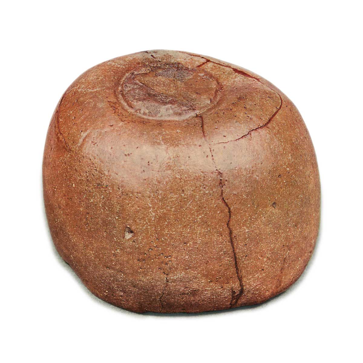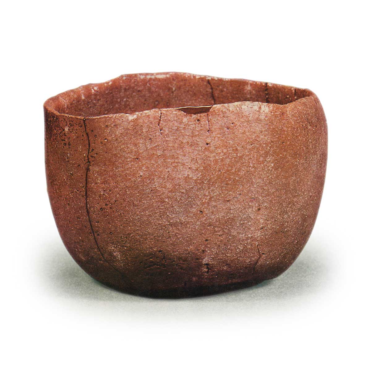 高台周围和垂直部分特有火裂纹。独特的压扁式高台,凹陷处乍看像棋盘底,更显光悦风格。口沿宽阔圆润,怀抱宽广。