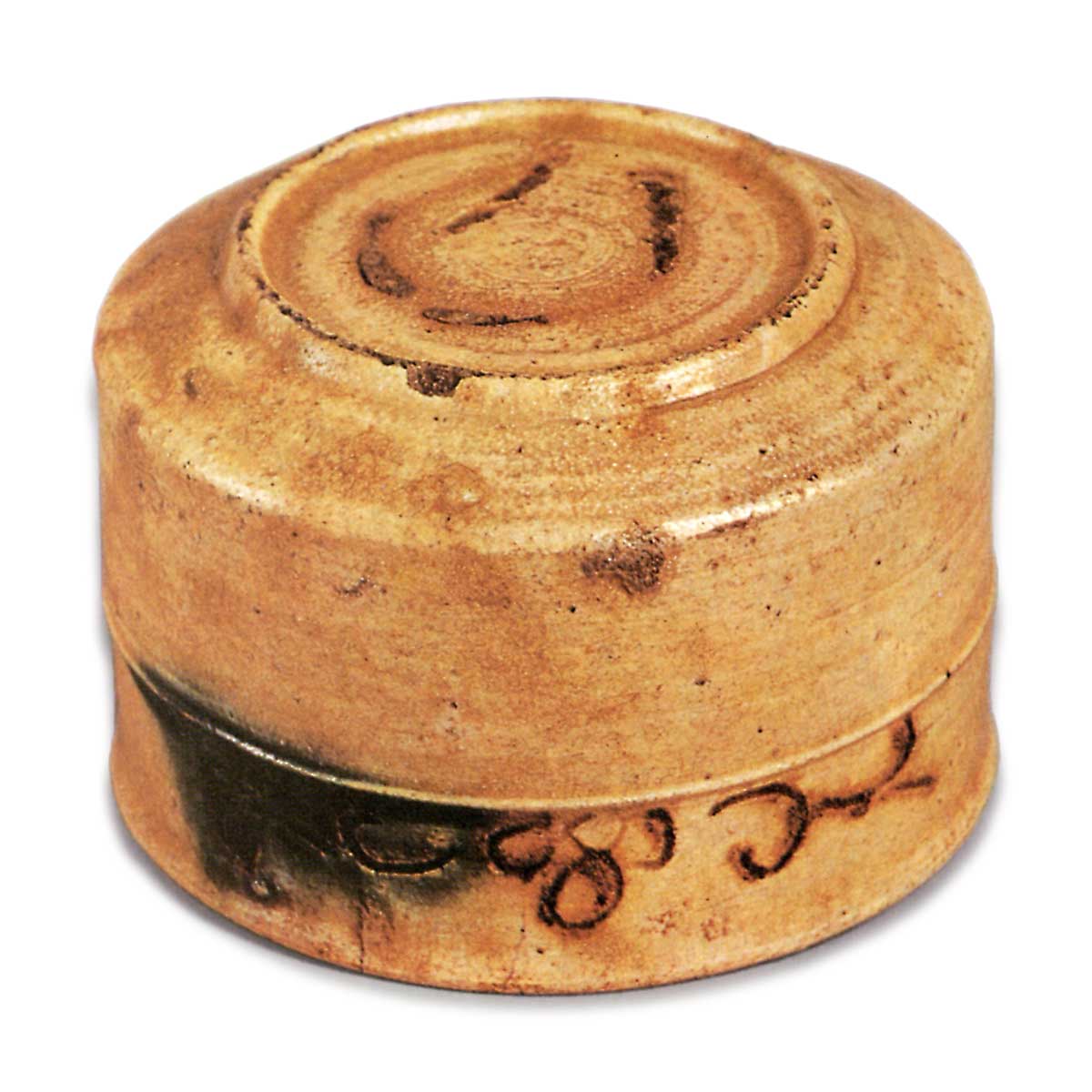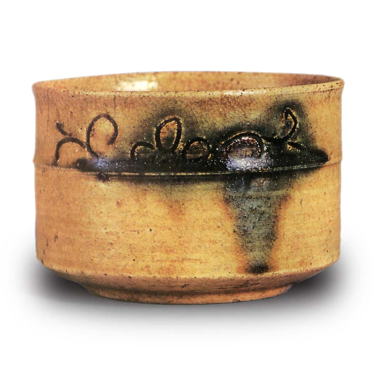 与“难波”齐名的茶碗,享有极高声誉。戸田露吟的《后学集》中记载:“黄瀬戸筒二所青二所黄黄瀬戸之内第一类元长田今三井”,可见该茶碗在露吟活跃的明治前期已作为茶碗使用,且声名显赫。茶碗从腰部直线向上延伸,口部略微收窄,圆润的口缘略带外翻。低而宽大的高台经过精心雕琢,整体造型薄而端庄。胴部环绕的一条胴纽线条简洁,有效地收束了筒形结构。胴纽上方以线刻技法装饰的四瓣花唐草图案,为作品增添了华丽氛围。整体覆盖的黄瀬戸釉色虽不如“难波”般厚重,但质感细腻。厚厚地浇注的胆礬流至边缘,色彩极为鲜艳。内壁的釉层比外壁稍厚,烧成深黄色。高台内有釉形留痕,其周围略带褐色的焦痕。