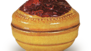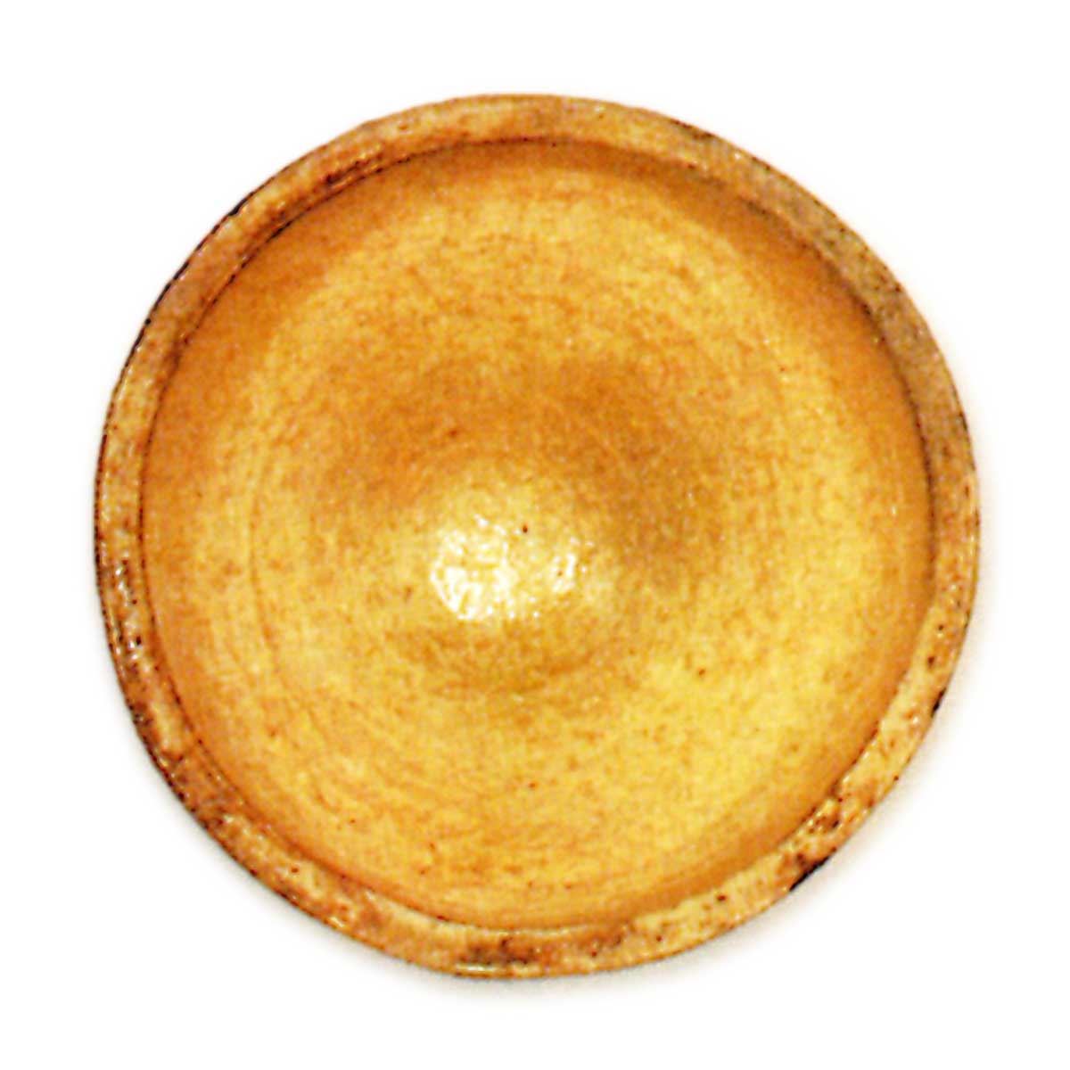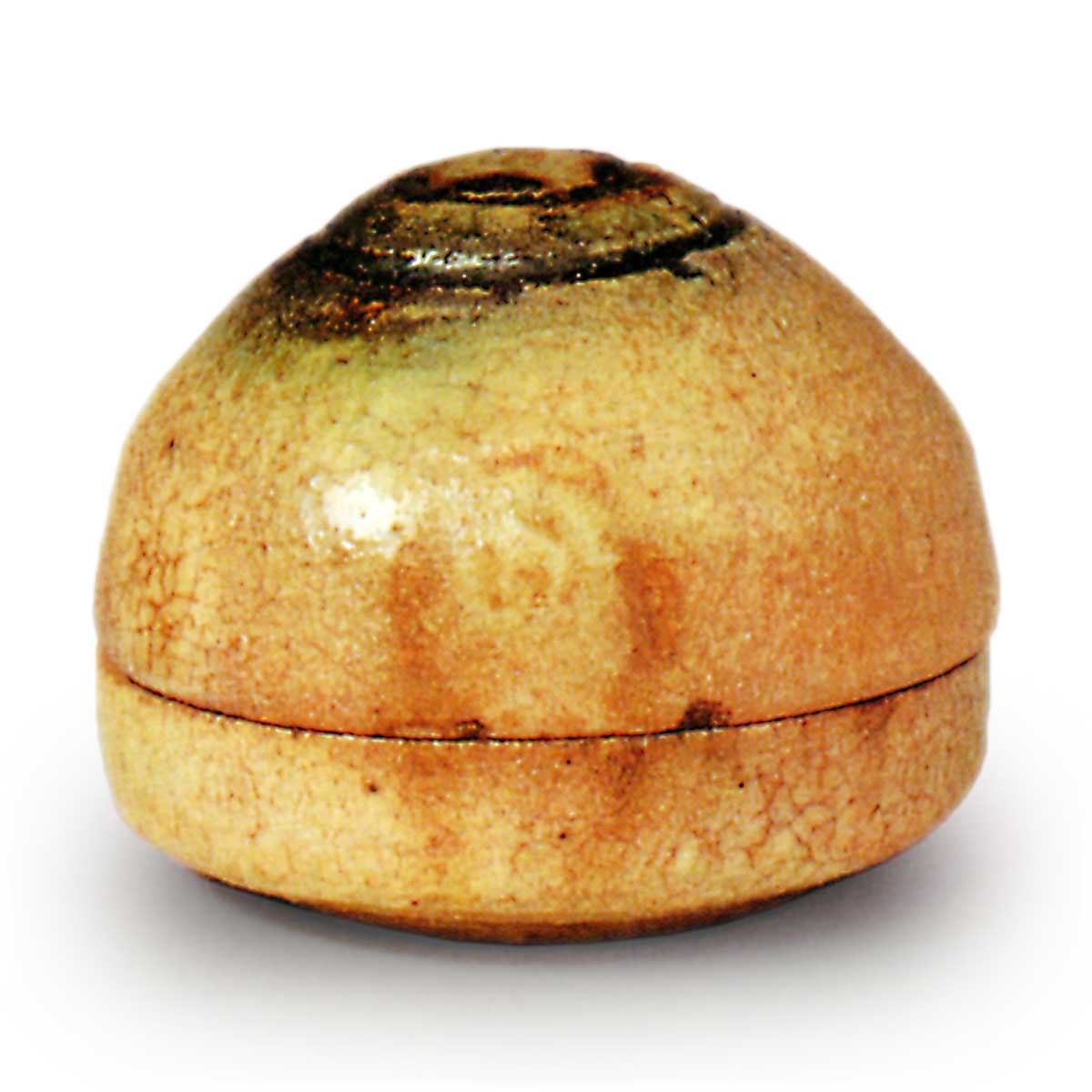 在和陶香合中,这或许可以称得上是第一流的杰作。我认为这是桃山时代“俺び”茶道所孕育出的最杰出的造型作品。这般柔和温婉的姿态,真是令人叹为观止。黄瀬戸的香合中,虽有以宝珠为造型的作品,但盖甲部分没有凸起的则不称为“宝珠”,而称为“根太”。如此丰满的宝珠形香合名作,天下仅此一件。采用印笼盖形式,底为碁笥底,底中央浅凹。盖顶以两条线环绕象征宝珠,线条上涂铁釉,再覆胆礬。该胆礬呈现出油扬肤的黄瀬戸釉质地,浓淡交织,若隐若现,背面透出淡淡青色,形成所谓的“抜け胆礬”。器身合口处露出土肤,身盖合烧后留有三处烧痕,底部残留半月形放置痕迹。