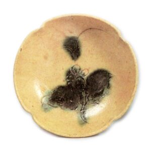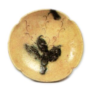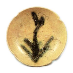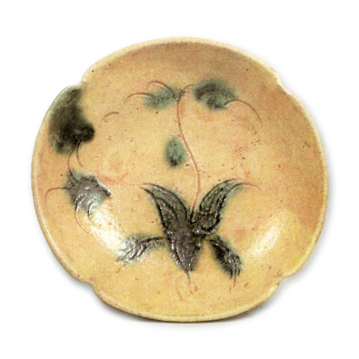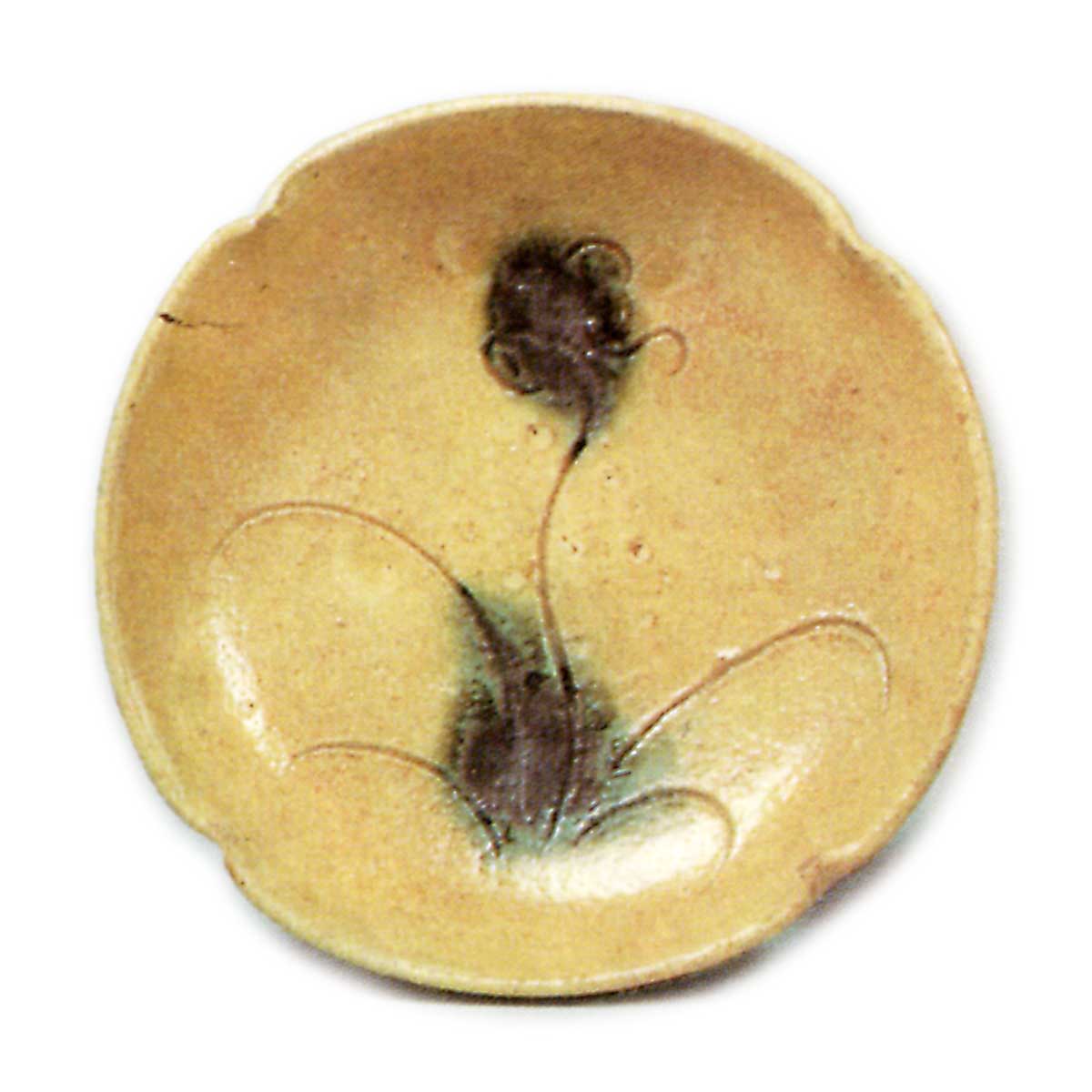 黄瀬戸 草花文 向付 日本黄瀬戸 草花文 向付 2025.07.16 黄瀬戸 草花文 向付 高度3.8~4.4.1厘米 口径14.8~15.5厘米 底径8.7~9.7厘米畠山纪念馆略厚实的盘形向付,四角捏成轮花形,每个轮花内侧刻有草花纹和丁香纹,以锐利的线刻表现,随意点缀胆礬。整体作风略显粗放,但几乎无其他例证,五件成套完整。底部附有低轮高台,高台内留有烧制痕迹。此前作品大多为黄瀬戸优质品,应出自大萱窗下窑,但此件可能出自其他窑炉。