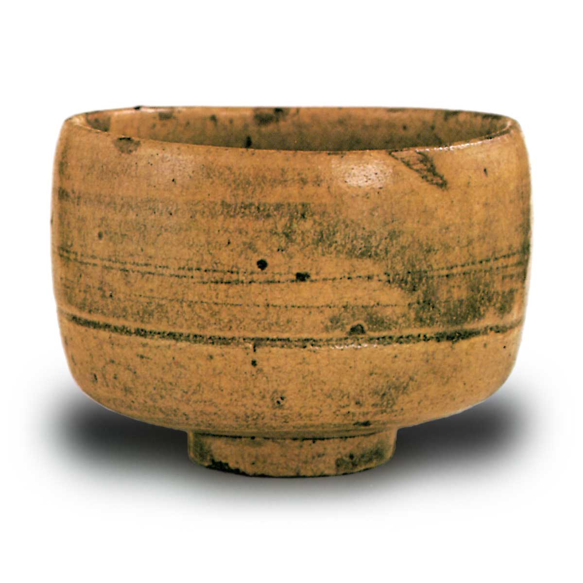 此茶碗曾为大阪鸿池家传世之物,且箱盖表面刻有“北向道陈好”字样,相传为利休所传。其造型与天目茶碗不同,与天正十四年左右在京都由利休喜好而由长次郎烧制的所谓“宗易形”长次郎茶碗极为相似。因此,若如传说所言,此茶碗为永禄五年(1562年)去世的道陈所喜爱的作品,并在美浓烧制,则可视为天正时代流行利休风格的先驱之作,具有重要研究价值。根据近年来对古窑址的发掘调查,此类器物确实在永禄年间有生产记录。高台内以朱漆书写利休的印章,高台略微深挖,采用削出高台技法,轆轤成形极为端正。
