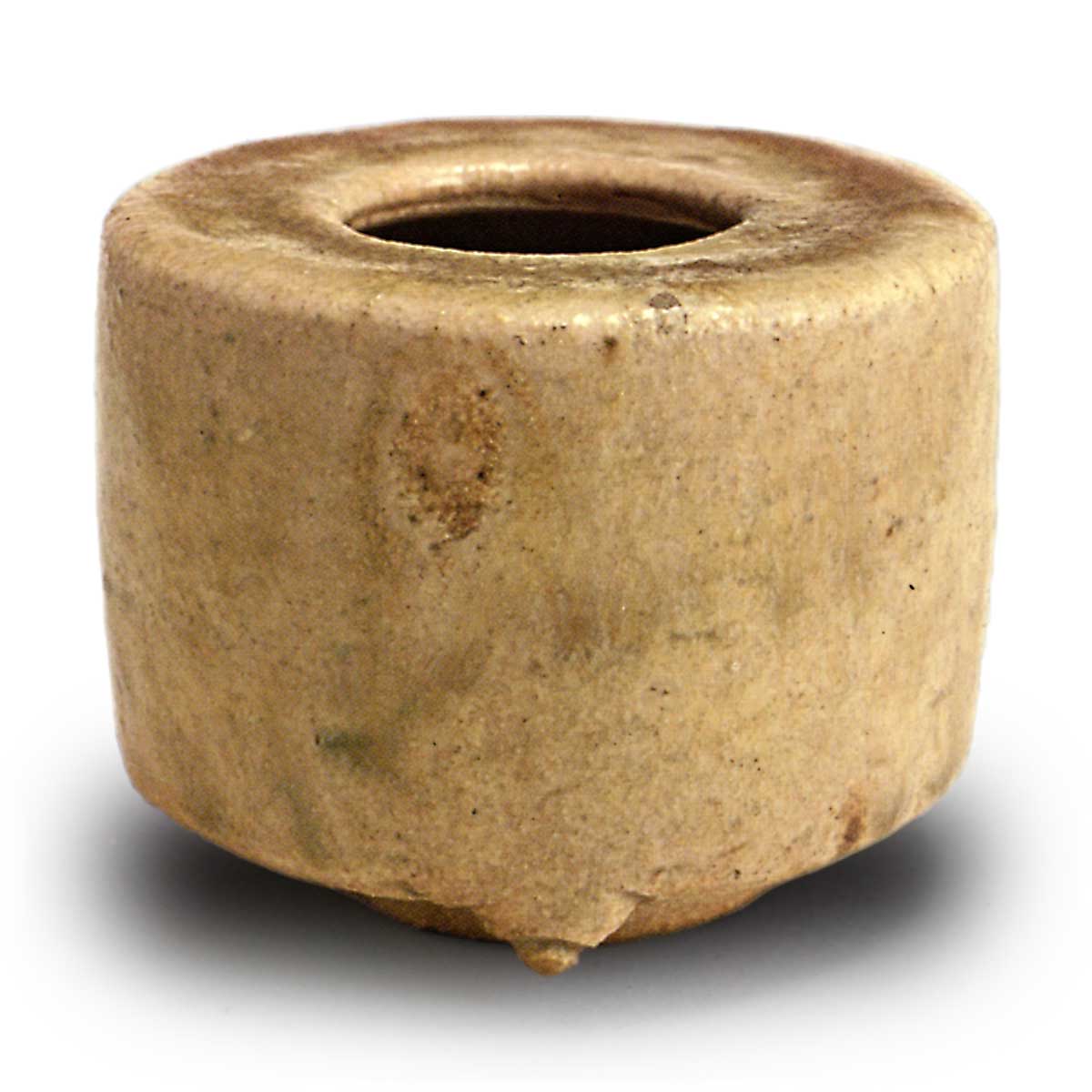 黄瀬戸 香炉 日本黄瀬戸 香炉 2025.07.16 黄瀬戸 香炉 黄瀬戸 香炉 高度6.4厘米 口径3.4厘米 高台直径4.2厘米 三脚千鸟形香炉的典型作品,口部收窄,底部三方有脚,底中央雕刻出圆形高台。黄瀬戸釉柔和融化,高台周围呈现淡淡焦痕,烧制成类似油扬手的釉面。此外,与该香炉完全相同的器型曾在长次郎窑烧制,推测可能属于天正年间流行的一种器种。