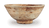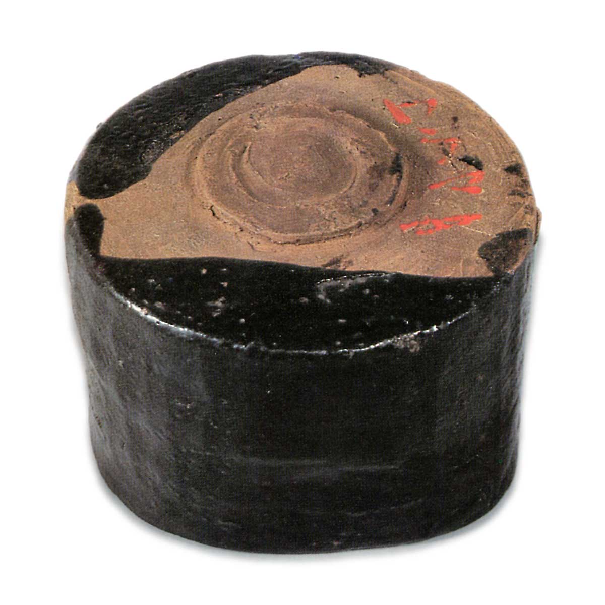 瀬戸黑 茶碗 铭ワラヤ 日本瀬戸黑 茶碗 铭ワラヤ 2025.07.22 瀬戸黑 茶碗 铭ワラヤ 瀬戸黑 茶碗 铭ワラヤ 高度9.7厘米 口径12.1厘米 高台径5.2厘米这是一只造型宏伟的瀬戸黑茶碗。口缘微微外翻,线条柔和起伏。碗身布满细密的纵向纹路,高台紧凑低矮,高台内侧的切口较浅。平坦的碗底中央设有浅而宽大的茶洼,中央呈现轆轤纹的涡旋状。釉面整体均匀覆盖。光泽不强,但质地柔和沉稳,内侧部分有部分呈现出琥珀色。灰白色的陶土细腻柔软。高台旁以朱漆书写“ワラヤ”铭文及花押,作者为表千家第六代传人觉觉斎原叟。