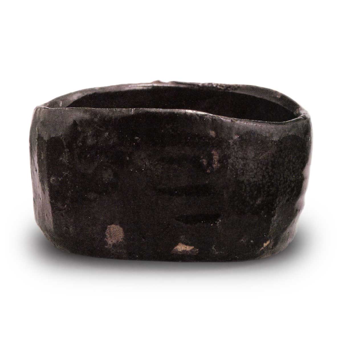 瀬戸黑 茶碗 日本瀬戸黑 茶碗 X Facebook Hatena Bookmark LINE Pinterest 复制 2025.07.22 瀬戸黑 茶碗 瀬戸黑 茶碗 高度7.7厘米 口径12.9厘米 高台径5.9厘米口部造型歪曲,高台极低,呈半筒形,但箆目清晰的制作手法极为有趣。口缘向内收缩,呈现起伏纹理。碗口边缘环绕着锐利的篾纹,碗身四处点缀着清晰的垂直篾纹。低矮的高台略显扭曲,高台周围的陶土表面呈现焦灼的质感。黑色釉料融化均匀,部分区域透出金属光泽。碗内茶洼呈圆形,内壁缓慢环绕着轆轤纹。