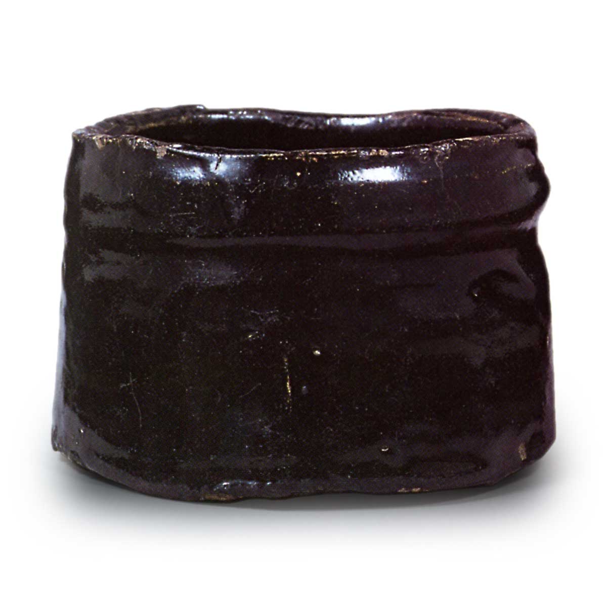 瀬戸黑 茶碗 铭玄海 日本瀬戸黑 茶碗 铭玄海 2025.07.23 瀬戸黑 茶碗 铭玄海 高度8.6厘米 口径12.1厘米 高台径5.7厘米口部周围采用织部风格的纹饰变化,但高台极低,腰部强劲外张。高台为小型附高台,并非如早期作品般采用削出高台。