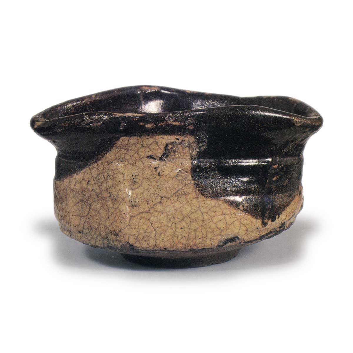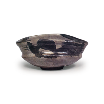 山路般蜿蜒的口部向外反卷,器身布满轆轤纹,腰部强劲挺拔,是典型的织部沓形茶碗。稍大的高台呈圆形削出, 垫脚宽广, 高台内有大小三道纹路。 腰部至高台处露出陶土, 陶土质地粗犷柔和, 器身一侧厚涂长石釉, 其他内外面涂黑釉, 但长石釉有粗糙的釉裂, 呈现红色调。器面和侧面以刮除黑釉的方式显露出芦苇和鹤的纹样,并点缀白釉,这些纹样均为抽象化的织部烧独特表现形式。器身中央有一条,左右各两条纵向纹饰,器身底部也刻有较深的雕刻,高台旁刻有“二”字窑印。整体烧制得极为柔和,在黑织部茶碗中尤为有趣,且具有深厚的韵味。