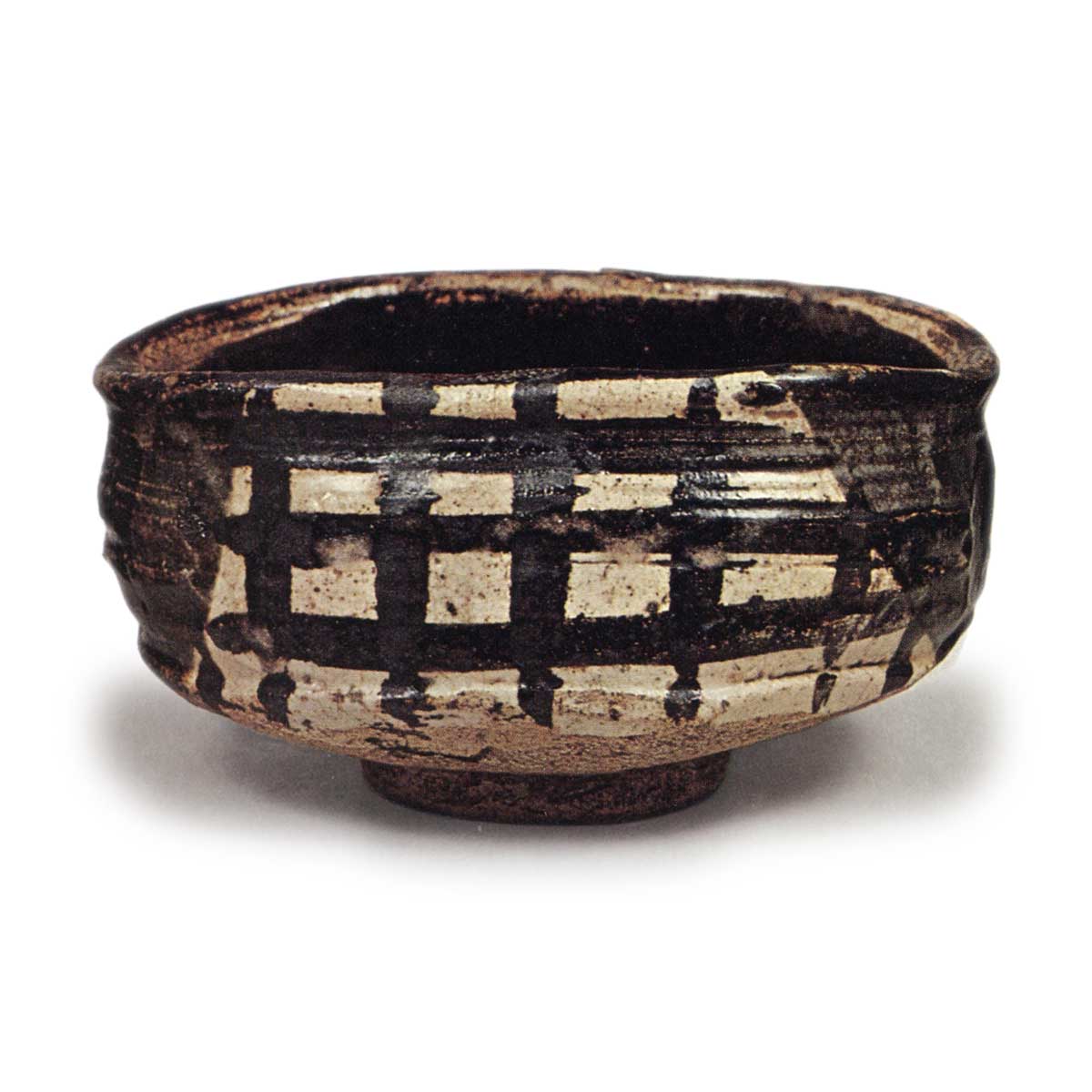 外侧正面及其对应的内侧分别绘有格子纹和横纹图案,除高台及高台周围外,整体施以黑釉,图案表面薄涂长石质白釉。口部周围的白色部分是在刮去黑釉后涂上白釉,部分黑釉上覆盖白釉形成双层釉,釉面呈现灰白色。 高台至腰部采用露土工艺,保留木箟痕迹,呈现略带坚硬的灰褐色土质。内盒盖内侧有“铭:破窗”的题款,应是因格子纹样而得名。此器曾为大阪鸿池家传藏之物。