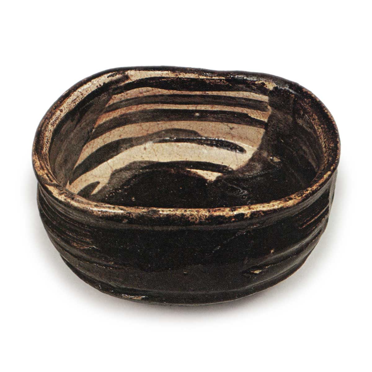 在黑织部沓茶碗中, 口部造型未做明显变化, 呈现出温和优雅的罕见造型。然而,口部环绕的箟目锋利,器身圆润膨胀,从腰部至高台处设有两处面切,器身底部环绕深箟雕,侧面左右亦饰有面切与缘雕等,织部风格的巧思随处可见。略微歪曲的圆形高台,作为织部沓而言较为小巧,高台内部呈圆形凹陷,中央形成兜巾状。