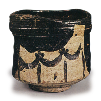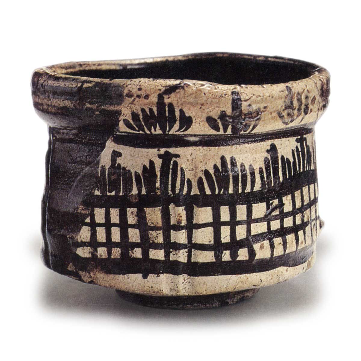 此茶碗与黑织部网干纹茶碗作法相似,但从口部至胴部几乎呈方形,高台为不规则圆形。口部设有台阶,胴部一侧刻有两条纵纹,另一侧刻有一条纵纹,表面施以白色长石釉与黑色釉料交错。薄涂的长石釉下绘有格子纹与菖蒲纹两层,黑釉覆盖的口部刮去釉料,以间道纹环绕,上方覆以白釉。此外,深陷的黑色釉面露出火痕,颇具趣味。碗上描绘的菖蒲与格子纹样,自古以来多见于甲胄等染革工艺,美浓陶工将其巧妙运用于茶碗之中。