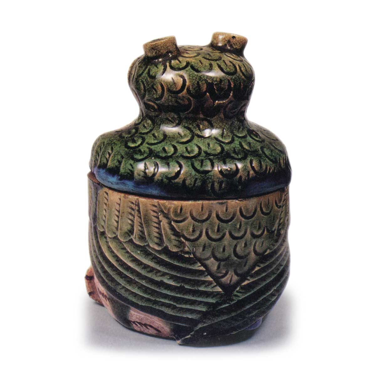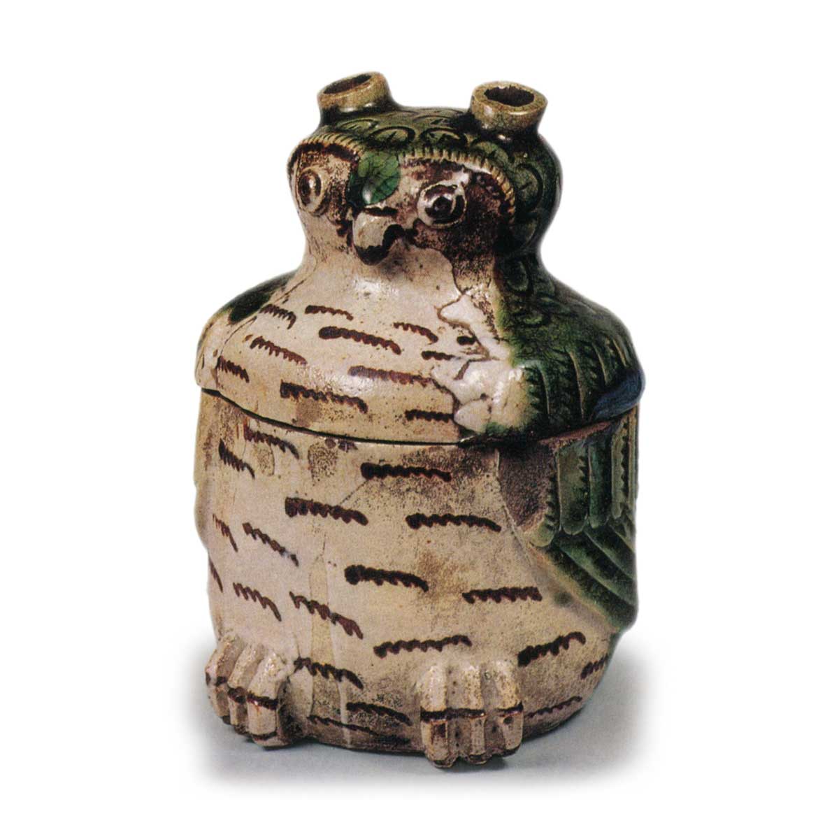 这款香炉以幽默的木菟姿态为设计灵感,轻巧灵动,令人赞叹。从脸部到胸部、脚部,以铁绘技法描绘了眼睛、喙部及羽毛等细节,上方薄涂长石釉,头部至背部则以印花与锐利雕刻表现羽毛与羽翼,并厚涂绿色釉。烧制后质地略显坚硬,但绿色釉的色泽极为鲜艳,令人印象深刻的杰作。