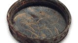 织部龟甲纹水注 容器织部龟甲纹水注 2025.07.27 织部龟甲纹水注 高度28.3厘米,胴径17.6厘米,左右22.7厘米,底径16.3厘米此器物曾作为水注使用,或是汤桶,具体用途已不可考,但在此类器物中堪称杰作,备受推崇。器形宽阔稳重,底部呈扇形展开,高大的轮高台自然削出,扭曲的把手与注口造型显得随性自然。口部中央附有圆形盖,盖中央系有绳索,以绿釉和铁绘装饰纹样,器身一侧饰有龟甲连纹,另一侧则呈现纵纹与轮击纹样。