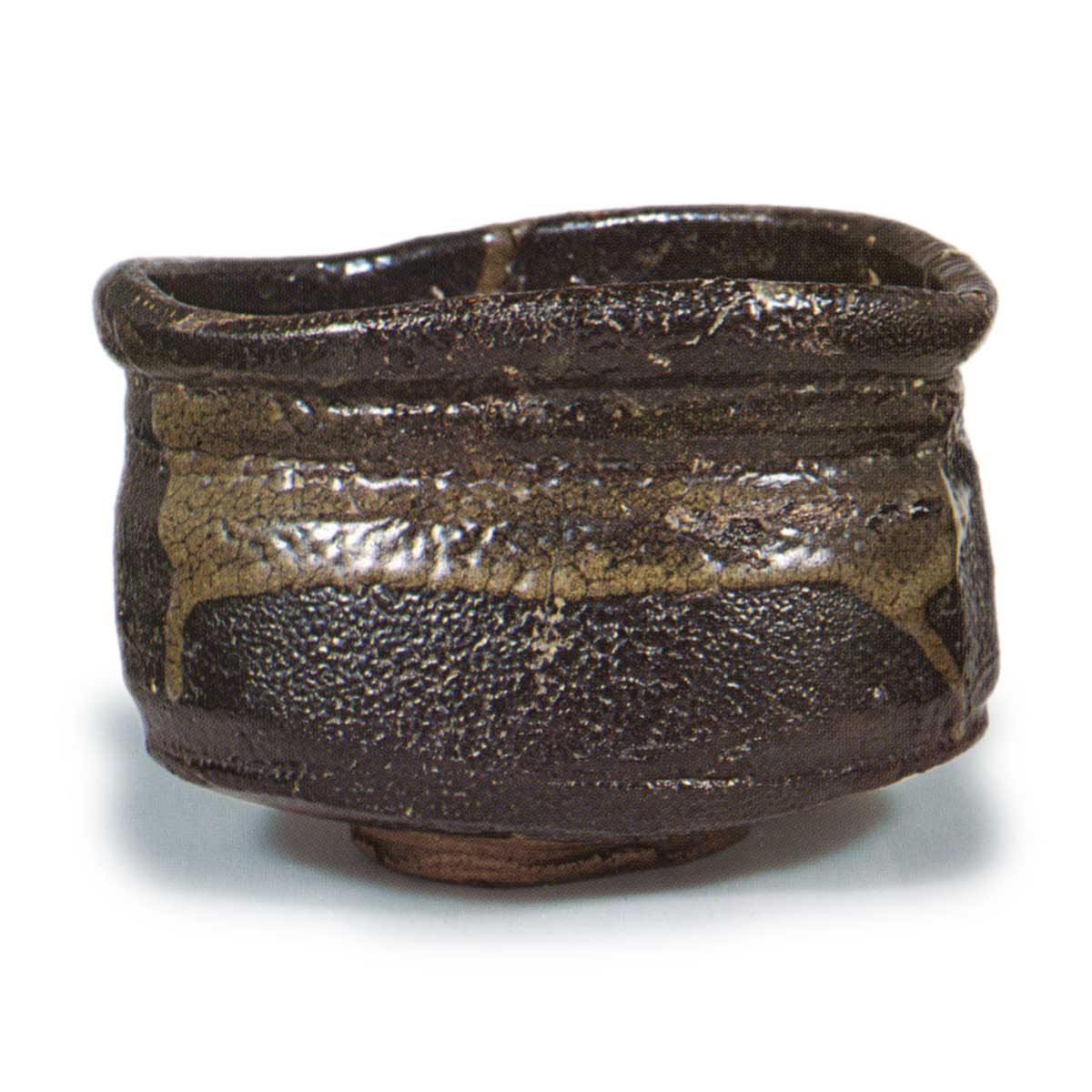 织部黑沓茶碗 日本织部黑沓茶碗 2025.07.27 织部黑沓茶碗 高度9.2厘米,口径12.2×13.9厘米,高台直径6.1厘米碗口厚实并带有阶梯状结构,腰部线条强劲挺拔,呈现典型的沓形。背面施以黑釉后部分剥落,露出白色底土。釉面质地柔和,高台侧面刻有“ハ”形印记,高台内侧留有石罅痕迹。