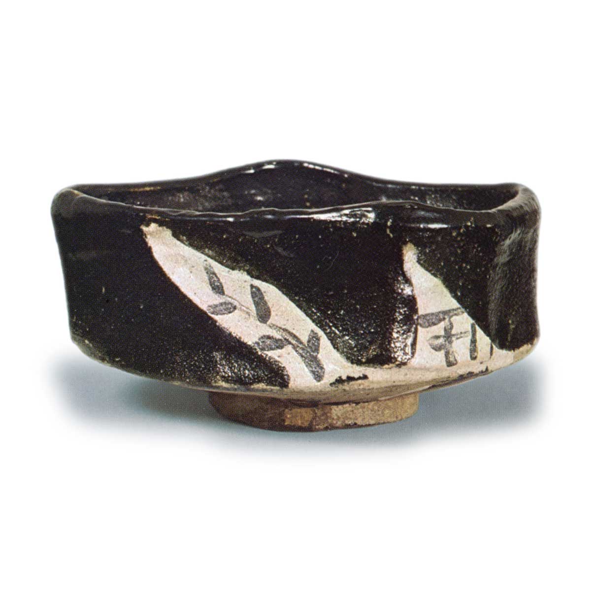 黑织部沓茶碗 日本黑织部沓茶碗 2025.07.27 黑织部沓茶碗 高度6.7厘米,口径10.6×13.5厘米,高台直径5.9厘米歪斜的长方形沓形茶碗,碗口略低,整体薄壁制作。 低矮的高台部分宽阔地削出, 碗身以白色镂空窗格装饰,颇具趣味。腰部以下为裸露陶土,烧制较为坚实。高台内刻有“L”形印记。