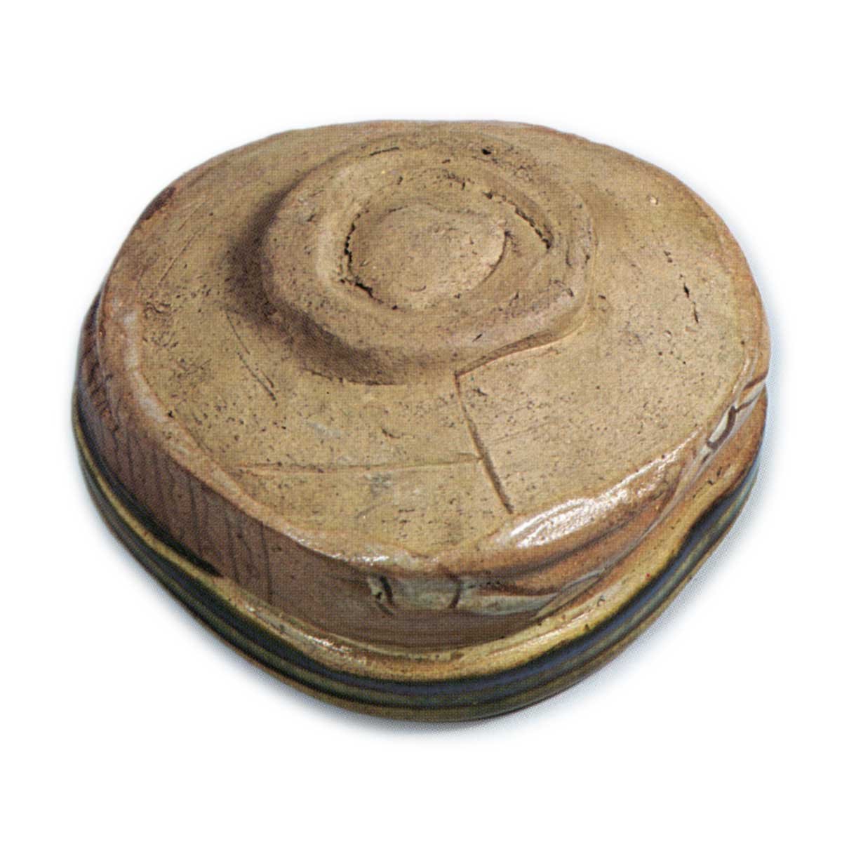 织部沓茶碗 日本织部沓茶碗 2025.07.27 织部沓茶碗 织部沓茶碗 高度6.7厘米,口径11.1×12.5厘米,高台径6.0厘米与织部沓茶碗作法相似的茶碗,碗身饰有瓔珞纹、历文及几何图案,高台边缘刻有“丁”字印。