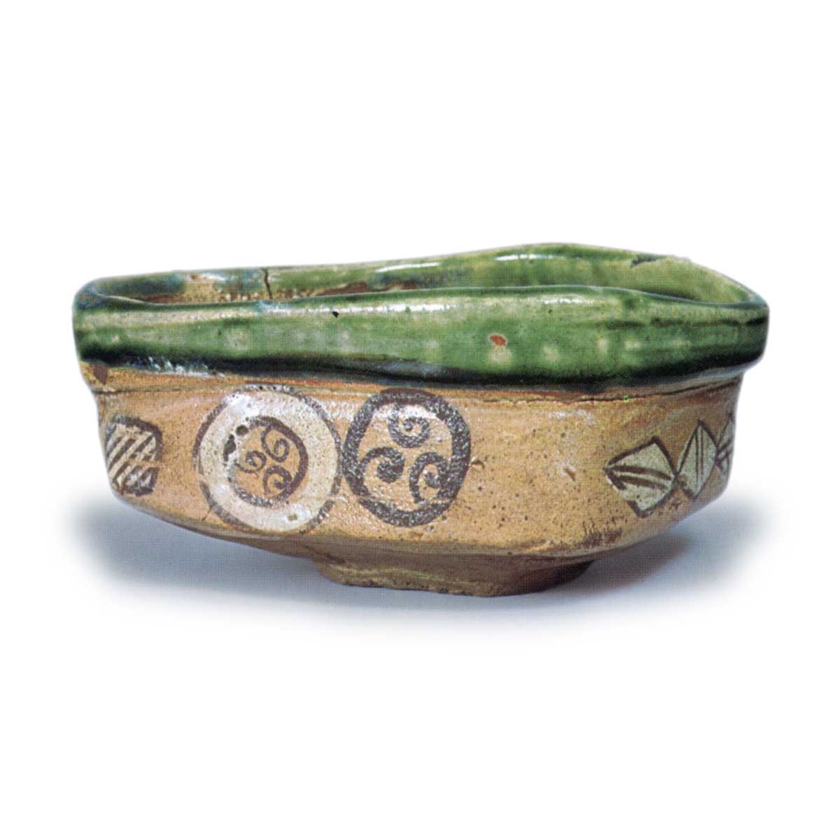 织部丸文沓茶碗 日本织部丸文沓茶碗 2025.07.27 织部丸文沓茶碗 高度6.4厘米,口径10.5×14.4厘米,高台径6.0厘米茶碗的釉面呈鲜艳的红色, 碗身绘有有趣的纹样。碗身饰有丸文、枡形文、乌恩顺骨牌、唐草风纹样等图案,连续排列,腰部一侧明显扭曲,造型活泼俏皮。碗身绿色釉料顺着腰部流淌至腰部。高台边缘清晰刻有“T”形印记。