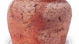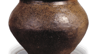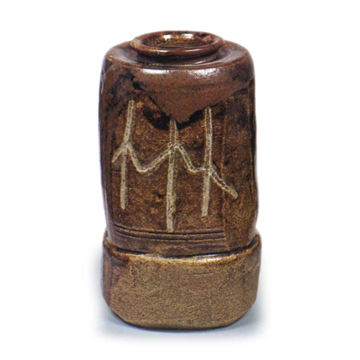 织部肩冲茶入 日本织部肩冲茶入 2025.07.272025.11.14 织部肩冲茶入 高度9.6厘米 口径3.1厘米 底径4.9厘米器身底部有阶梯状设计,肩部外展,低口外张,整体呈敦实造型,器身表面以抚四手法处理。胴体正面釉料被刮除,露出线刻纹样,其上涂有长石釉。与黑织部茶碗采用相同技法的作品存在,但本品釉色烧成茶褐色。 传自西本愿寺, 盖底贴纸记载: “越前养德寺正僧为遗物献上 寛永三年亥九月上旬”, 表明该作品烧制于庆长、元和之间。