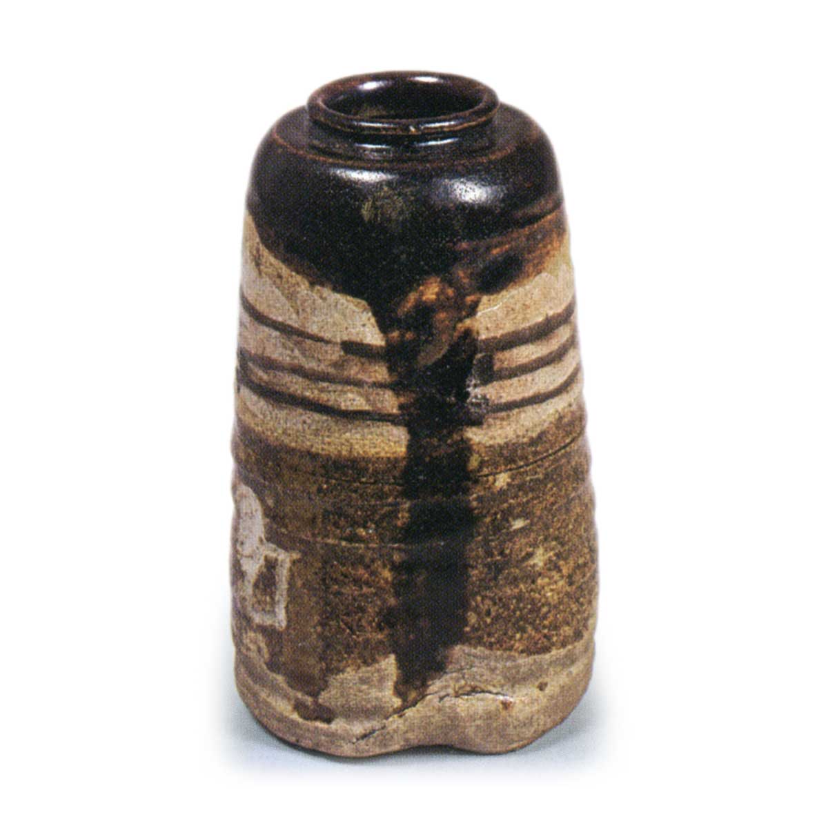 黑织部肩冲茶入 日本黑织部肩冲茶入 2025.07.272025.11.14 黑织部肩冲茶入 高度10.3厘米 口径2.9厘米 底径5.1厘米茶罐底部呈喇叭形,肩部圆润,肩部呈圆润的抚形。罐身涂有薄铁釉,中部环绕三道横纹,口部涂有黑釉, さらにあたかも釉なだれのように黒釉を一筋胴裾まで塗っています。造型独特的茶罐,底部有“×”形雕刻。