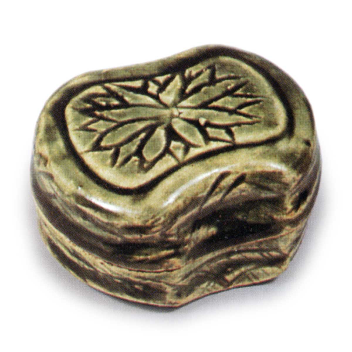 织部菊纹分铜形香合 日本织部菊纹分铜形香合 2025.07.27 织部菊纹分铜形香合 高度4.1厘米,口径4.7×5.1厘米,底径4.3×4.8厘米这款分铜形香合造型粗犷,合口采用印笼盖形式。除合口部分外,身与盖的几乎整个表面均施以绿釉,但浅削的高台部分露出陶土本色。盖顶部低处设有阶梯,并雕刻有菊花纹样。相较于同类香合,此件尺寸较为大型。