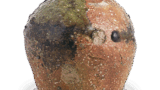 织部香合 日本织部香合 2025.07.27 织部香合 高度4.8厘米,口径3.9×4.6厘米,底径3.5厘米梅泽纪念馆该香合与弓形手柄的前图相似,手柄根部设有研磨座。一侧施以绿色釉,另一侧则呈现出类似短条纹的图案。其陶土与釉面均质地柔和,在织部烧香合中堪称佳作。