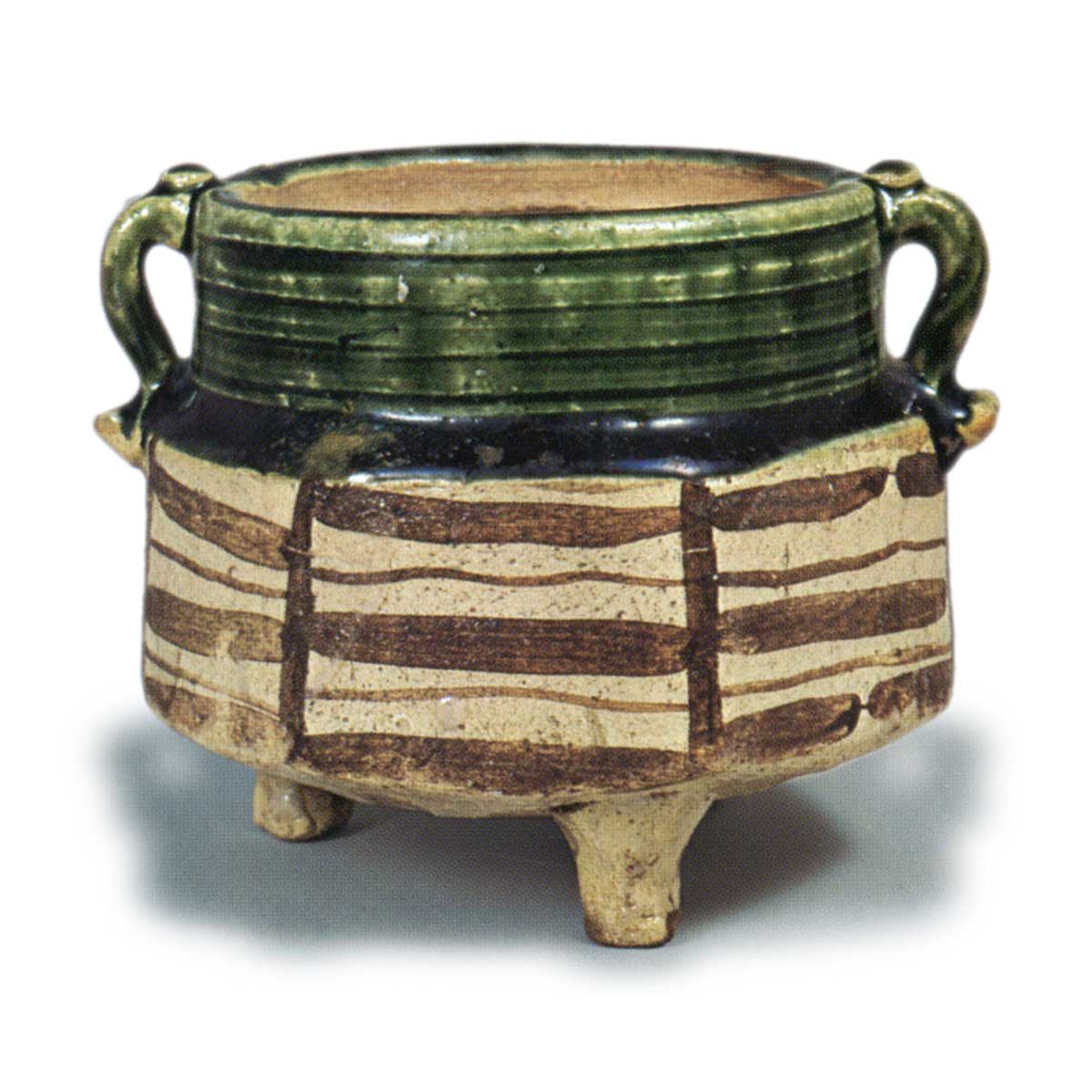 织部间道纹耳式香炉 日本织部间道纹耳式香炉 2025.07.27 织部间道纹耳式香炉 高度9.3厘米,口径8.8厘米,左右宽11.6厘米,三脚口部呈圆形,胴体为六角形,左右两侧各有一个耳,底部平坦,三面各有一只脚。上部施以绿色釉, 胴部以铁绘颜料绘制间道纹, 从底部至脚部均覆盖长石釉, 绿色釉色鲜艳,整体烧制柔和。 过去应配有盖子。 内部露出白色陶土质地。