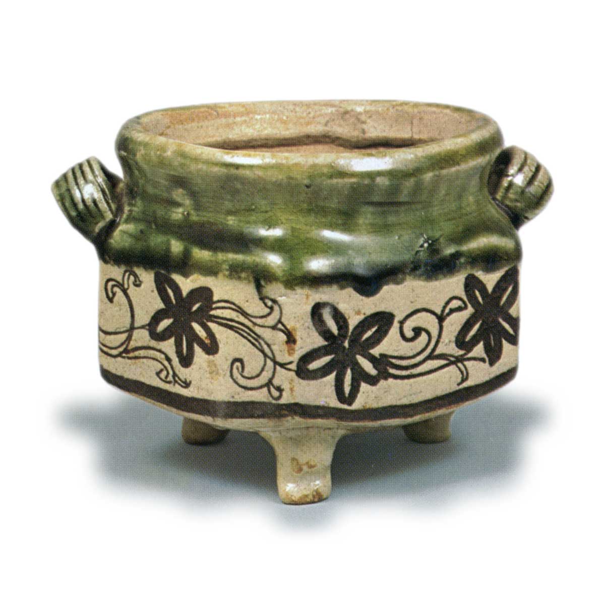 织部唐草纹耳式香炉 日本织部唐草纹耳式香炉 X Facebook Hatena Bookmark LINE Pinterest 复制 2025.07.27 织部唐草纹耳式香炉 高度8.7厘米,口径9.1厘米,三脚畠山纪念馆炉身呈五角形,与图113所示的香炉基本相同,但耳部横向延伸,炉身饰有花唐草纹。笔触粗犷的花纹与细腻的线条相映成趣,显得格外轻快。
