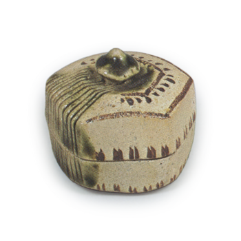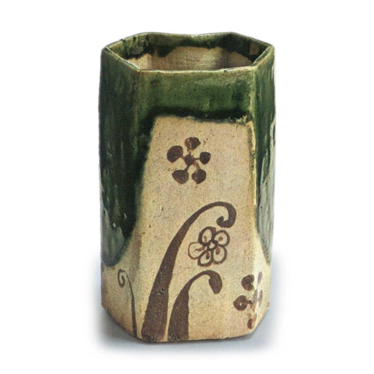 织部蕨梅花纹火入 日本织部蕨梅花纹火入 2025.07.27 织部蕨梅花纹火入 高度11.8厘米 口径5.7×7.2厘米 底径 6.0×7.3厘米万野美术馆采用模具压制成六角筒形,内部未施釉,露出素地肤,表面带有布纹。口部至胴体左右两侧施以绿色釉,白地一侧绘有梅花、梅鉢与蕨纹,另一侧则描绘瓔珞纹。绘画以锈色呈现,烧制后明亮柔和。底部采用碁笥底式,中央呈圆形浅凹。