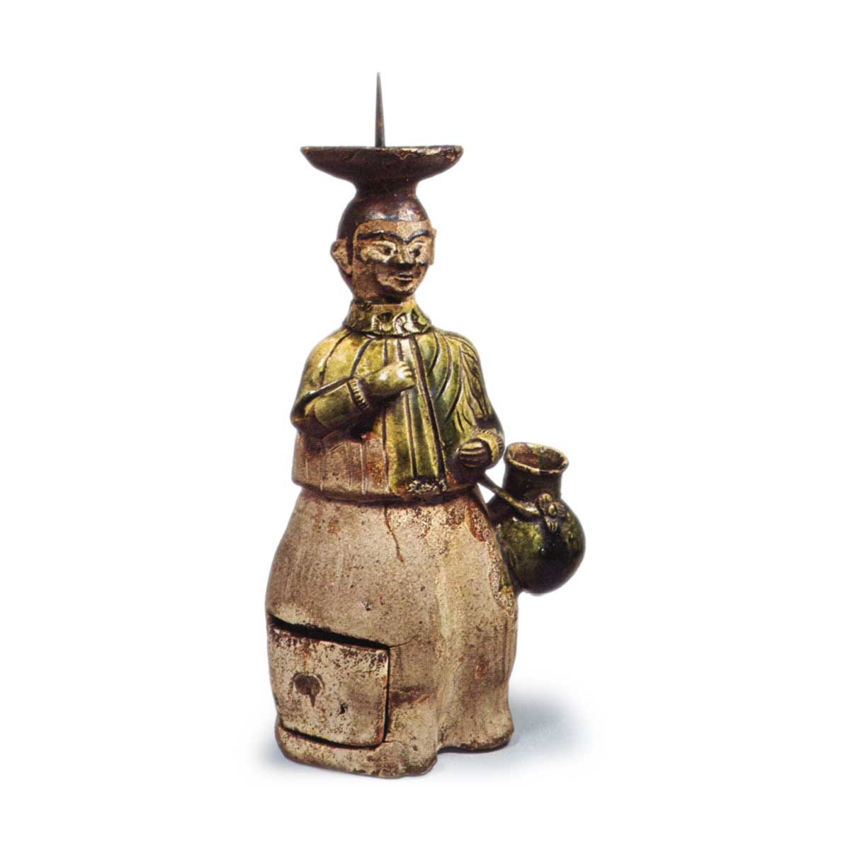 该烛台以葡萄牙人,即桃山时代人们所称的南蛮人为原型创作。织部烧瓷器早期便吸收了外来文化元素,如所谓的十字纹样和南蛮纹样等,并将其设计化。这些烛台便是最典型的例子,以独特的风俗为灵感创作烛台的构思堪称巧妙。描绘了身着轻衫的男子形象,图120中,袴上绘有草花纹样,从烛台器部至人物腰部覆盖厚重的绿釉,釉流延伸至五道左右。上衣前后以梅鉢纹装饰,共五枚,以轮花图案表现。图121以锈釉表现头发、眉毛和眼睛,上衣领口处印有菊花图案,左手提着篮子。轻衫的侧面被切开并加装抽屉,或许是打算放入焚壳。在现存的南蛮人烛台中,这两件最为精美。