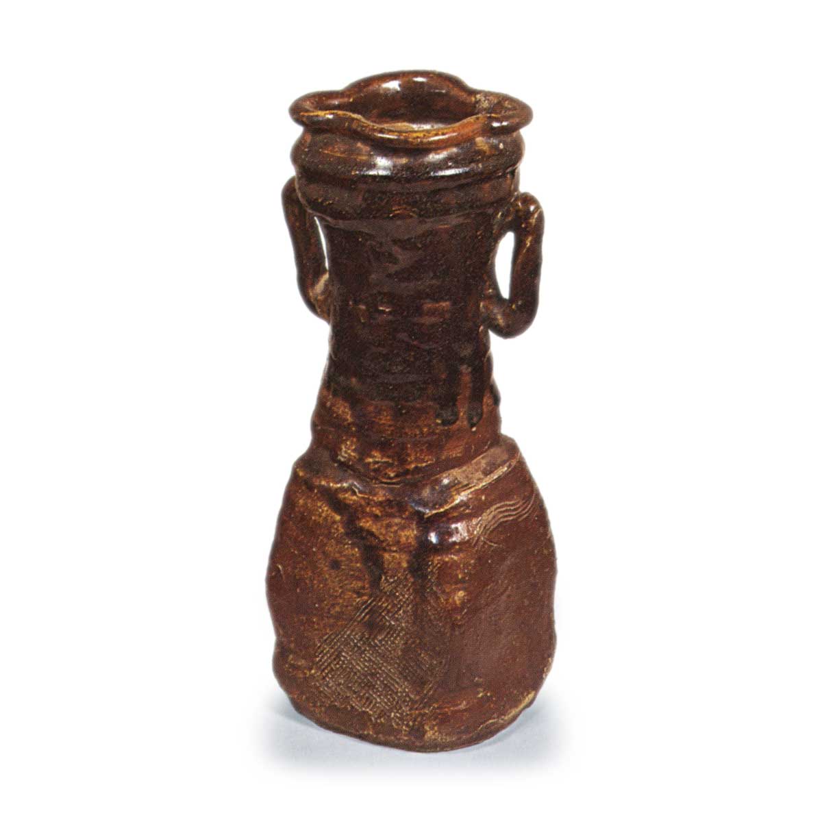 口部呈木瓜形,边缘向内卷曲,颈部收窄,主体部分向下展开,底部平坦,颈部两侧带有耳状装饰。主体部分部分饰有网目和梳齿纹。全身厚厚地涂抹了浓淡不一的糖釉。其制作风格与唐津甕屋谷出土的黑色糖釉水指极为相似,是推测两地技术交流的珍贵资料。